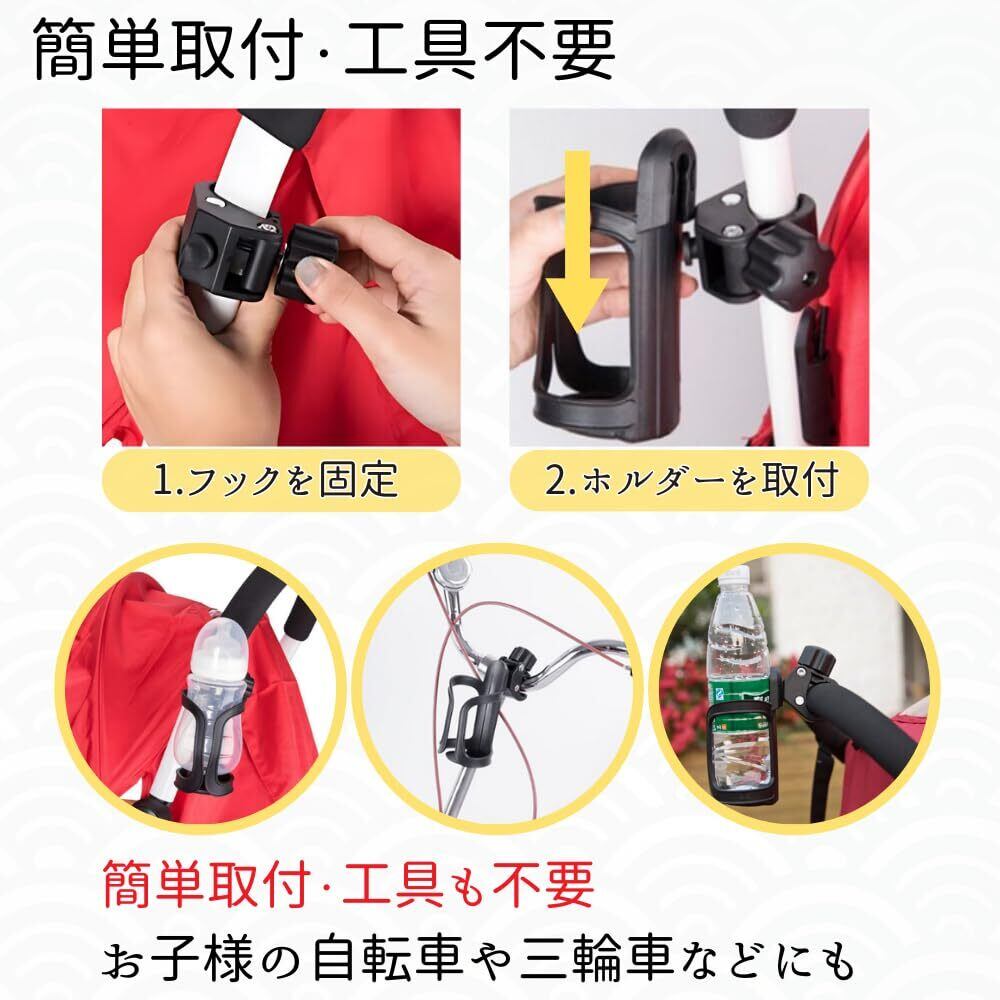 【楽々出し入れドリンクホルダー】ペットボトルや水筒などスムーズに取り出せるドリンクホルダー。自転車でのサイクリングや、ベビーカーでのお出かけにピッタリ。飲みたい時にすぐに出せる。2個セットだから、パートナーやお子様と一緒に使える便利なお出かけサポートアイテムです。