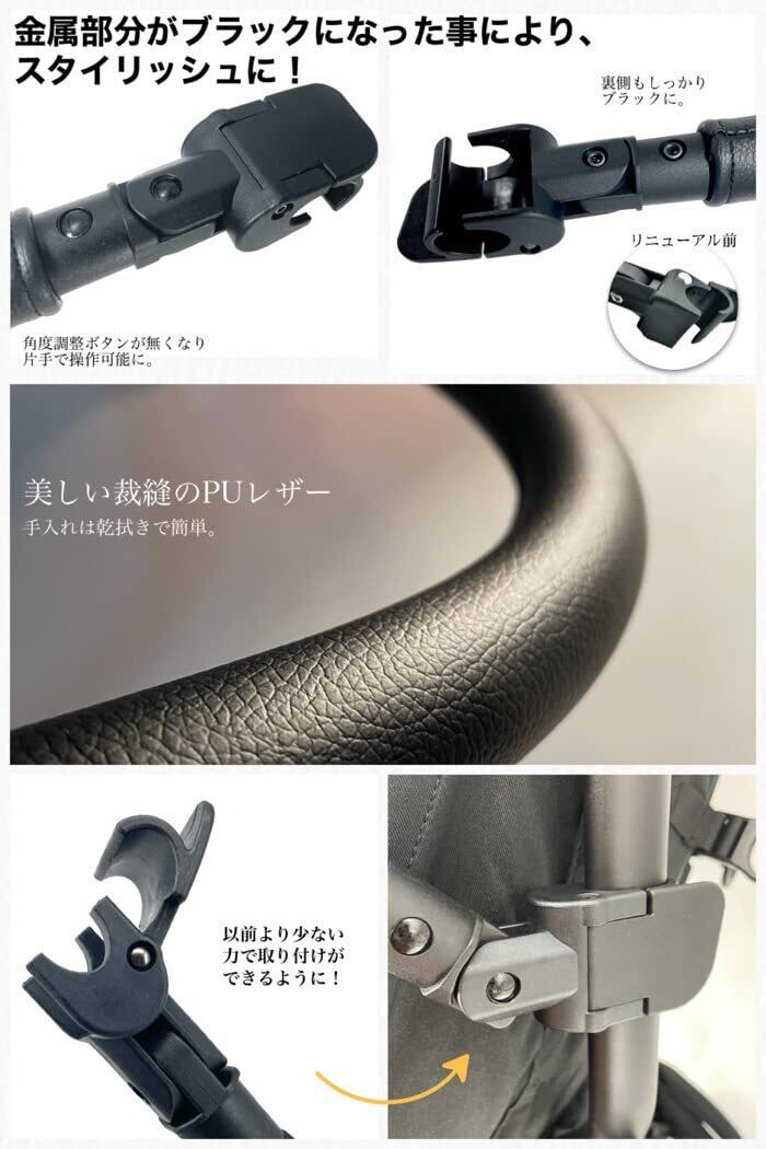 リニューアルポイント:①角度調整ボタンをなくし、片手で無段階調整可能に ②ハンドル部を少ない力で取り付けできるように改良 ③金属部をシルバーからブラックに変更