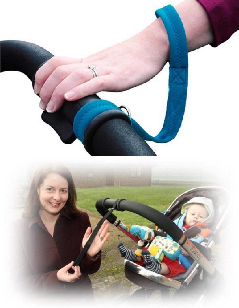 ベビーカーと手首をストラップで繋ぎます。