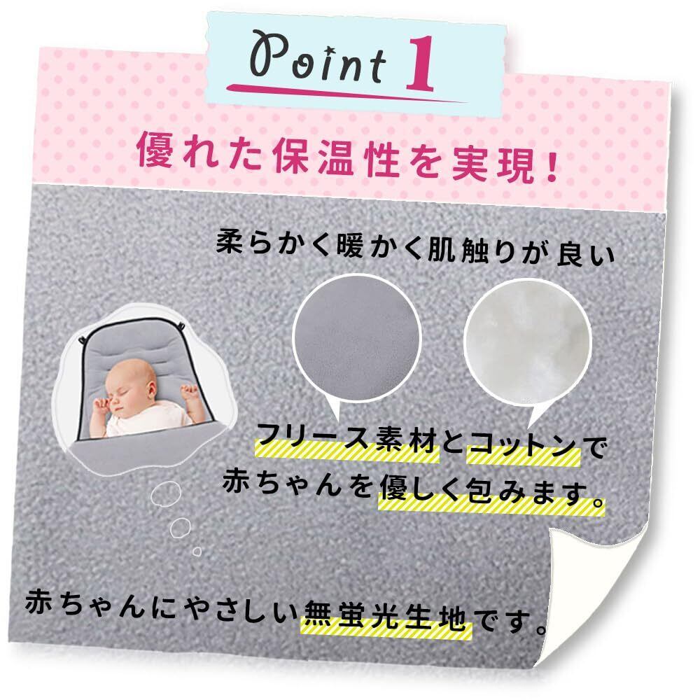 柔らかく暖かく肌触りが良いフリース素材とコットンで赤ちゃんを優しく包みます。
