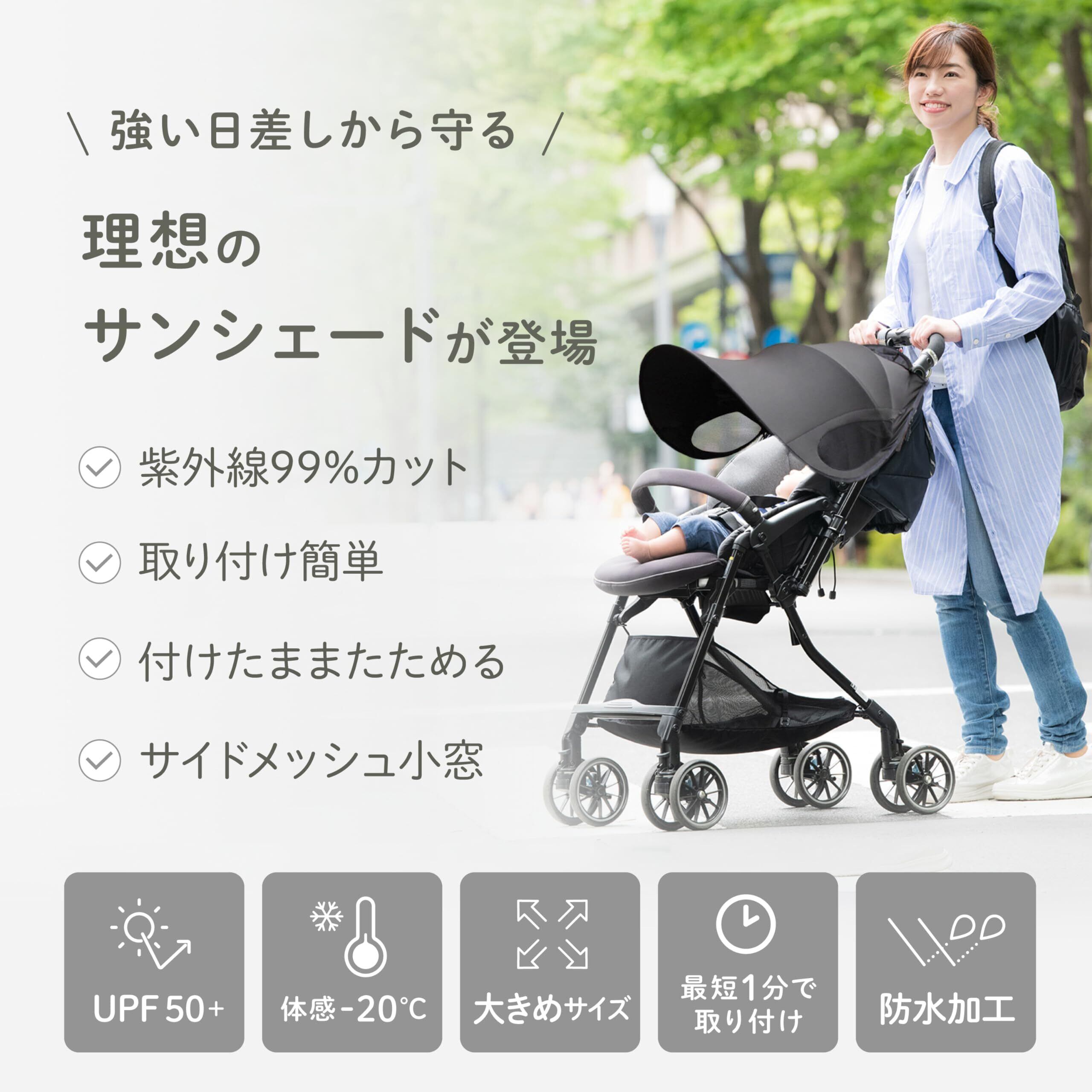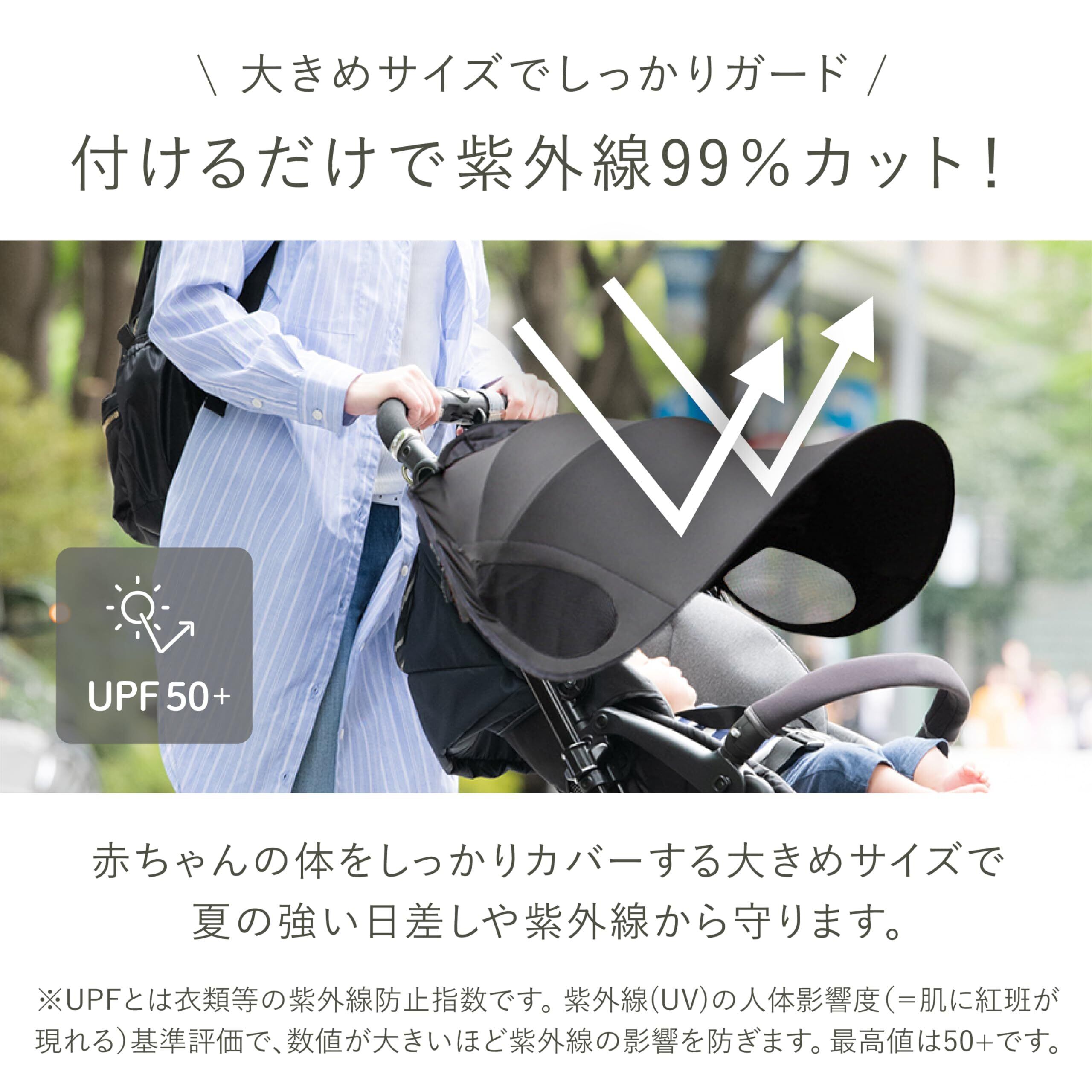 【特徴】・紫外線99%カット ・取り付け簡単 ・付けたままたためる ・サイドメッシュ小窓 ◎嬉しいポイント◎ ・UPF50+ ・体感-20℃ ・大きめサイズ ・最短1分で取り付け ・防水加工 cybex、Combi、Aprica、Pigeon、Joieなどのベビーカーに取り付け可能!※ページ内の取り付け可能メーカーをご確認下さい ※対面式には対応しておりません。