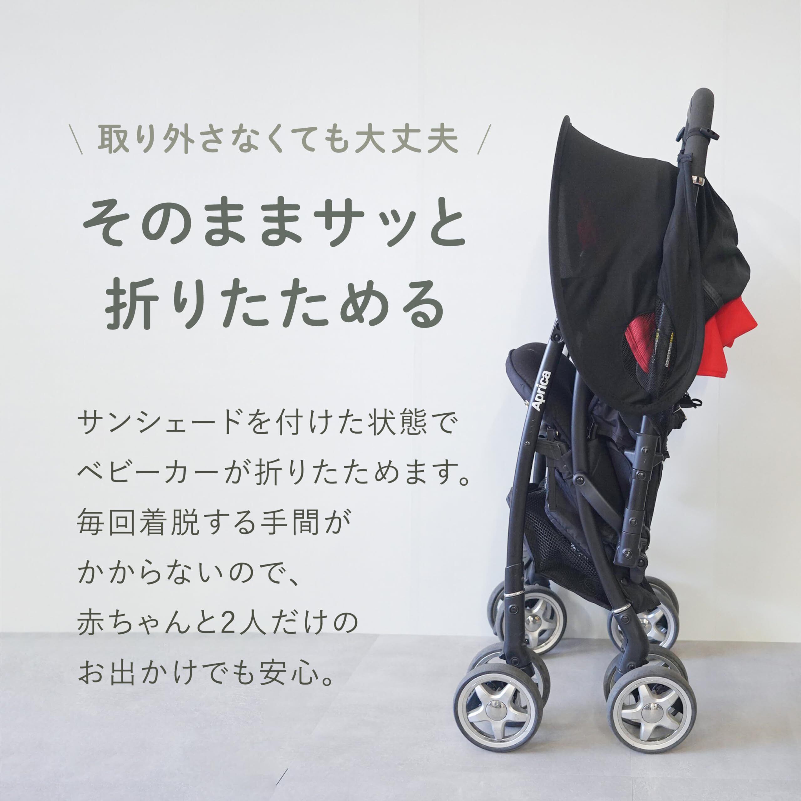 【最短1分!カンタン取り付け】\わかりやすい説明書付き/写真入りで順序がわかりやすい!すぐに使える説明書付きです。 【そのままサッと折りたためる】\取り外さなくても大丈夫/サンシェードを付けた状態でベビーカーが折りたためます。毎回着脱する手間がかからないので、赤ちゃんと2人だけのお出かけでも安心。