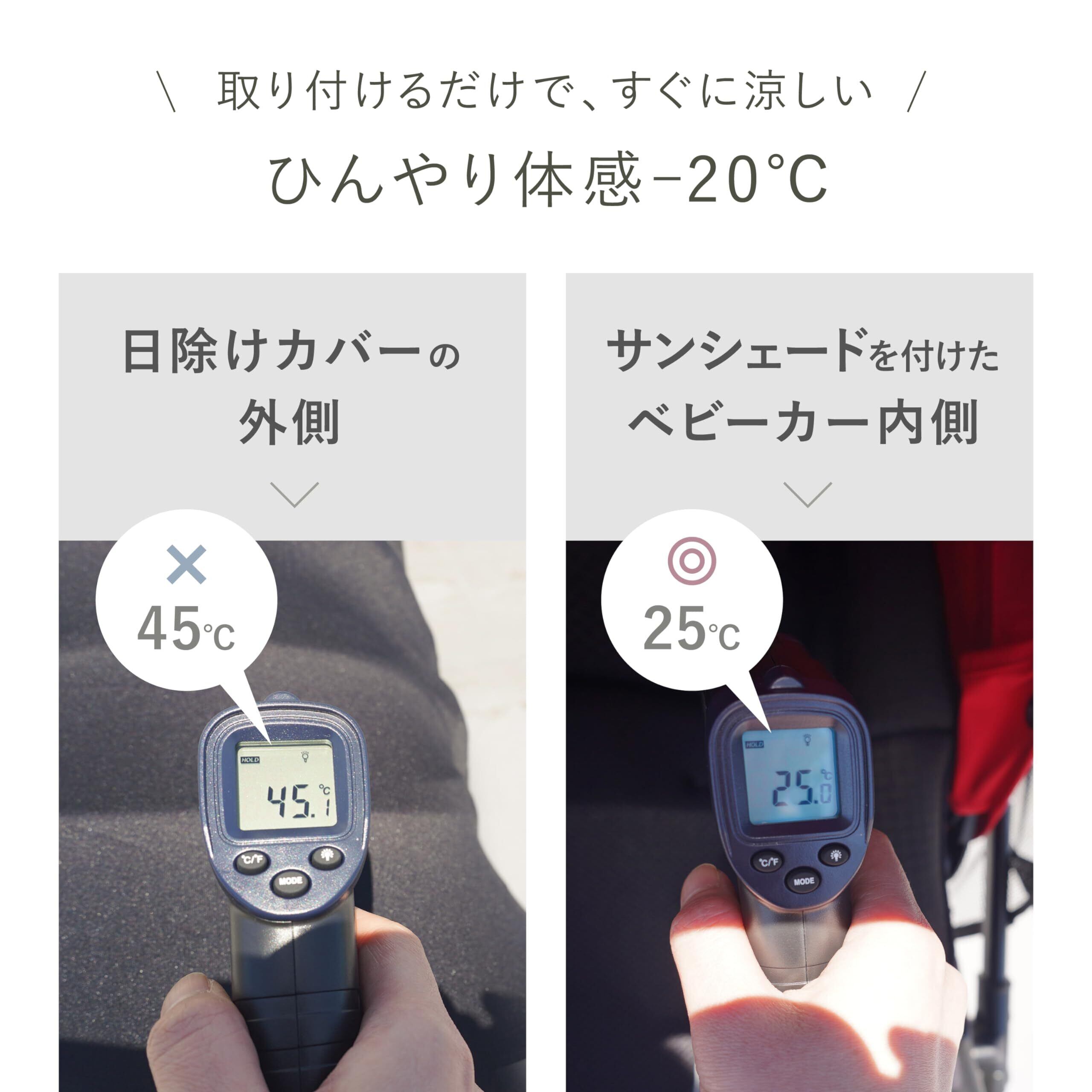 【角度調整できる】サンシェードを外さなくても、細かい角度調整が可能!簡単にお好みの角度に調整できます。 【ひんやり体感-20℃】\取り付けるだけで、すぐに涼しい/日除けカバーの外側が45℃→サンシェードを付けたベビーカー内側は25℃まで温度が下がりました!