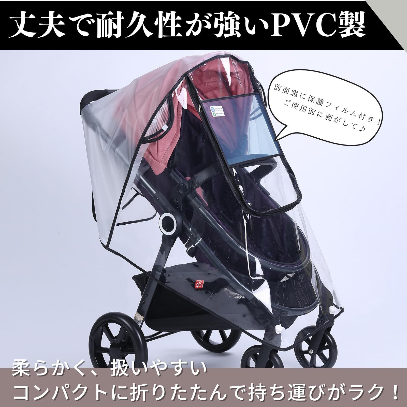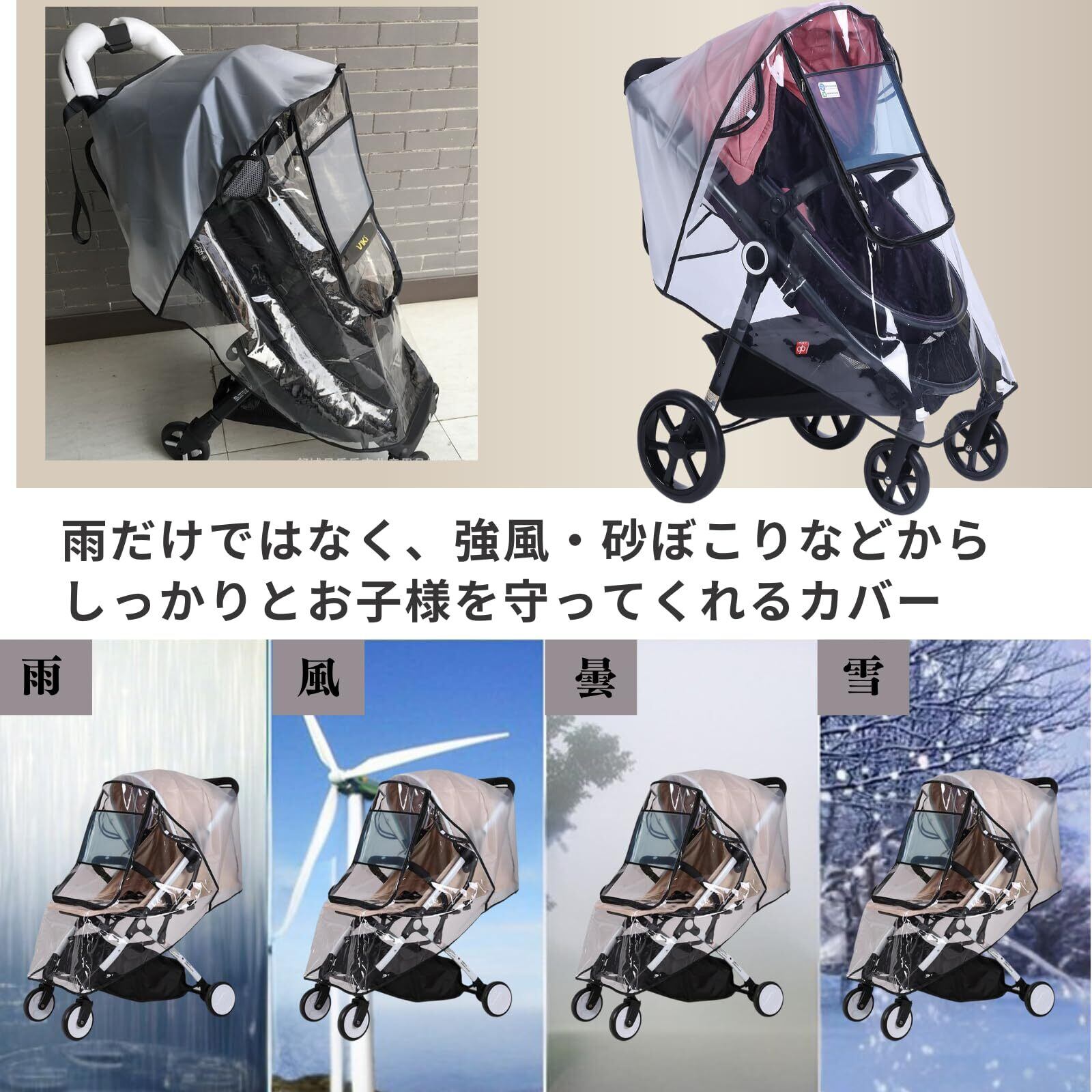 【ベビーカー用レインカバー】透明カバーで視界も良好!しっかりとした防水素材で作られており、突然の雨や強風、砂埃などからお子様をしっかりと保護します。寒い季節の防寒対策としてもおすすめです。