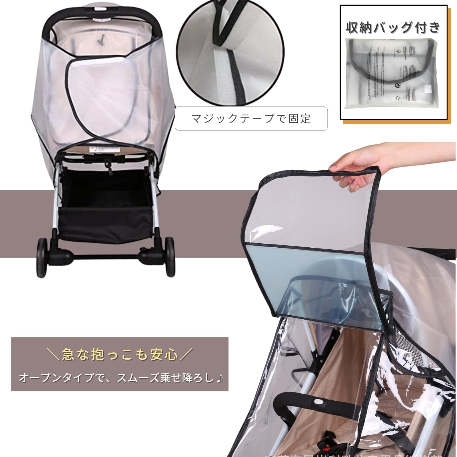 オープンタイプだから、カバーを取り付けたままファスナー開閉で、ベビーの乗せ降ろしができます。雨だけではなく、強風・砂ぼこりなどからしっかりとお子様を守ってくれるカバーです。