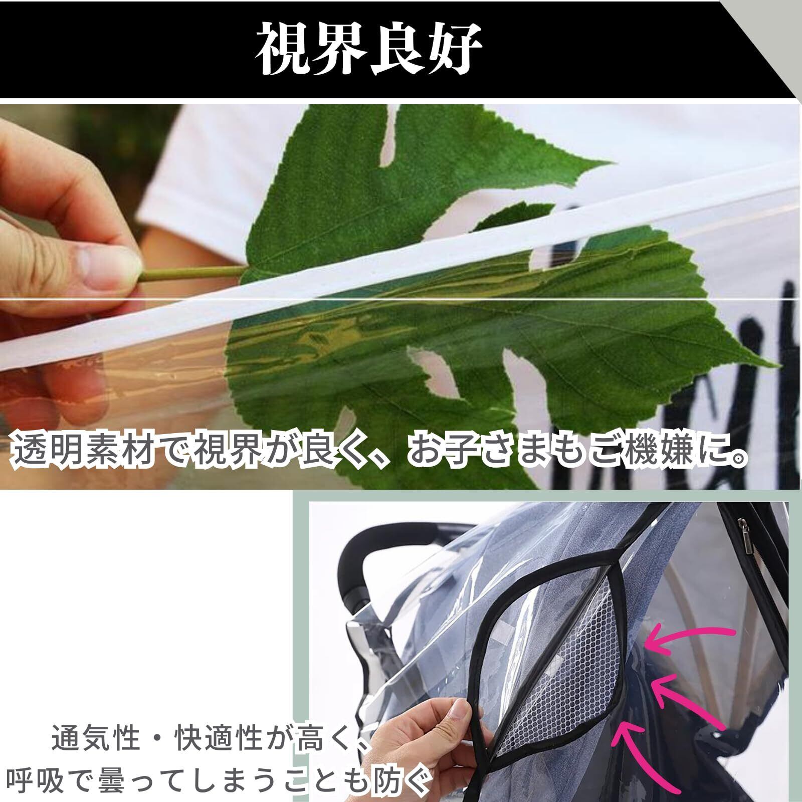 【視界良好】透明素材で視界が良く、お子さまもご機嫌に。左右に通気口付きで通気性・快適性に優れ、呼吸で曇ってしまうことも防ぎます。雨の場合は、通気メッシュ蓋が閉じられます。