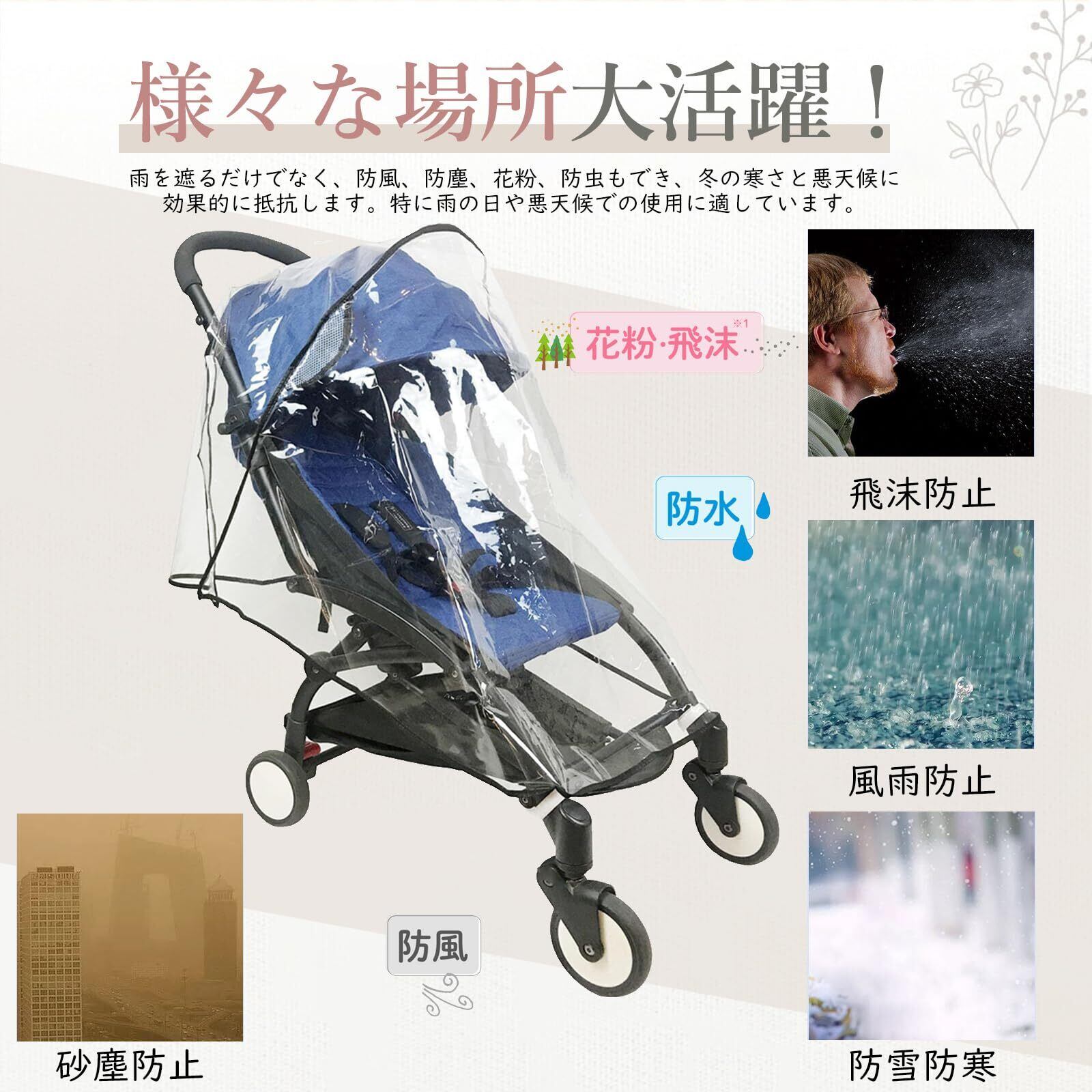 【様々な用途】ベビーカー カバー 防水は雨を遮るだけでなく、防風、防塵、花粉、防虫もでき、冬の寒さと悪天候に効果的に抵抗します。特に雨の日や悪天候での使用に適しています。