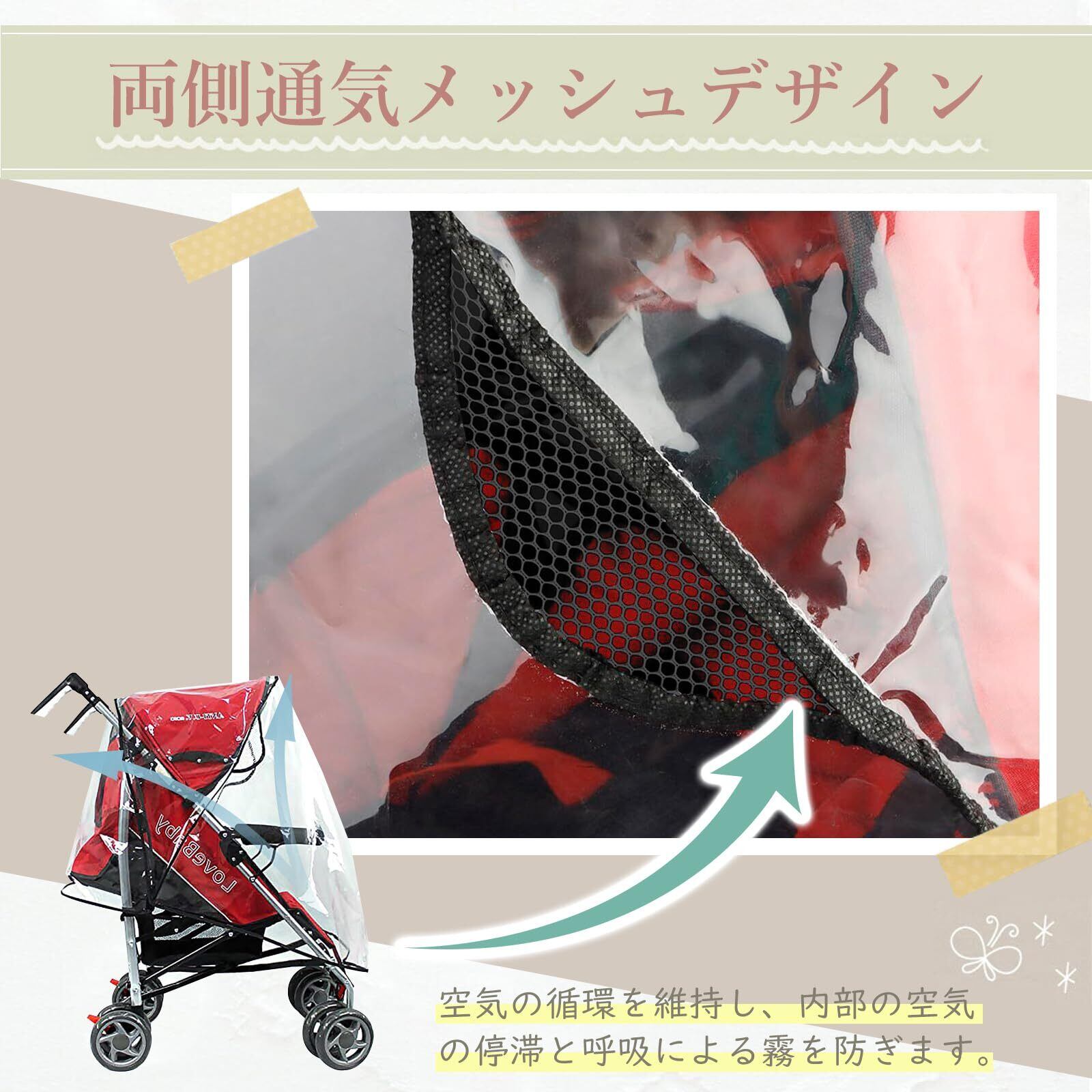 【両側通気メッシュデザイン】ベビーカー用レインカバーの両側は通気性メッシュデザインを採用し、通気孔を設置し、空気の循環を維持し、内部の空気の停滞と呼吸による霧を防ぎ、熱中症と雨の日の不快感を防ぎます。耐久性があります。