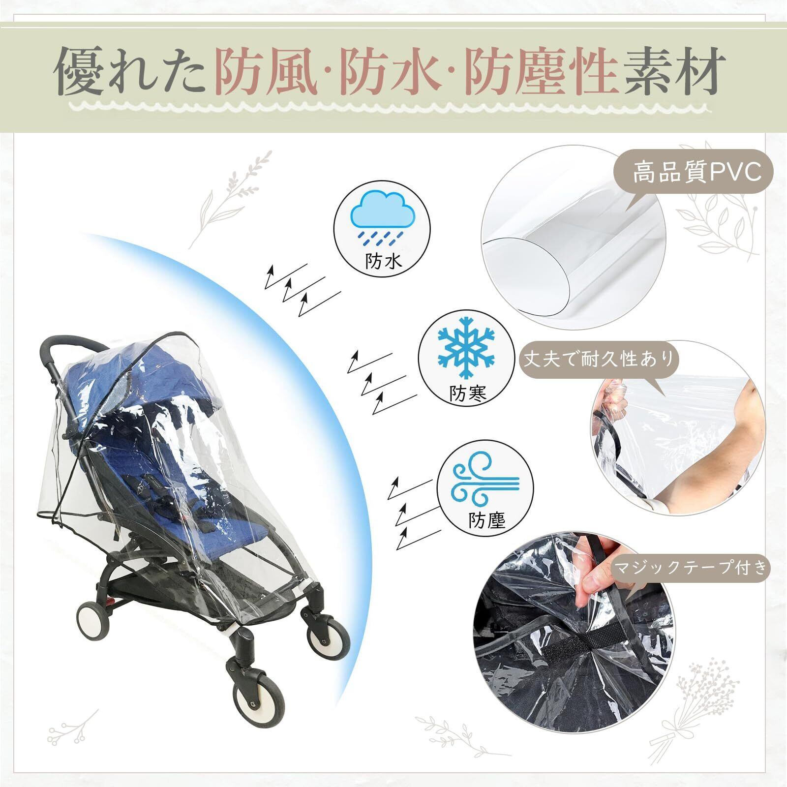 【優れた防風防水防塵性素材】ベビーカー カバーは丈夫で耐久性のあるPVC素材で作られており、質感が柔らかく、曲がったりしわが寄ったりしにくいだけでなく、持ち運びに便利で、使用しないときに折りたたんで収納することもできます。突然の雨、強風、ほこりを効果的に防ぎます。