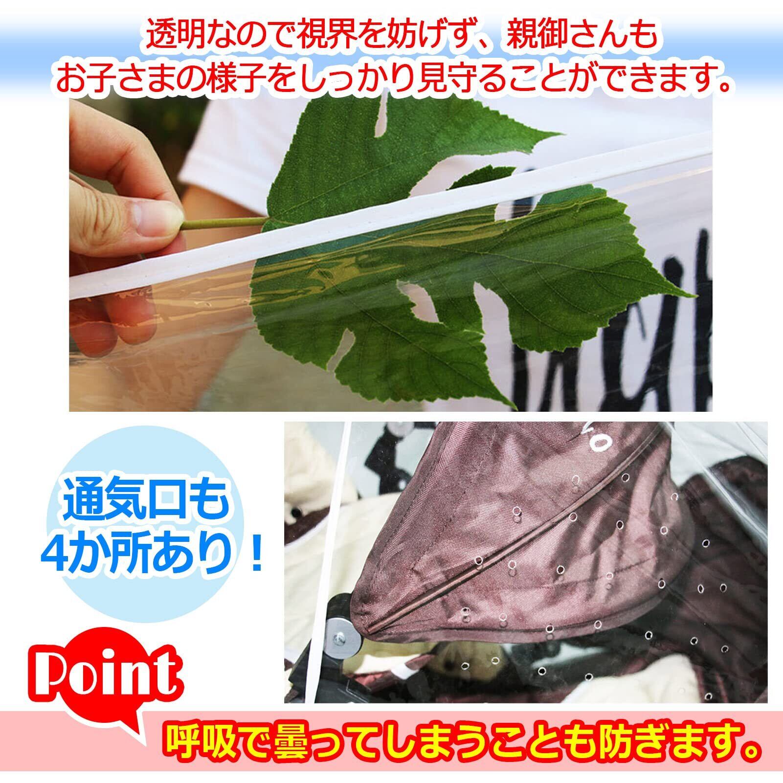 透明なので視界を妨げず、親御さんもお子さまの様子をしっかり見守ることができます。通気口も4か所あり!呼吸で曇ってしまうことも防ぎます。