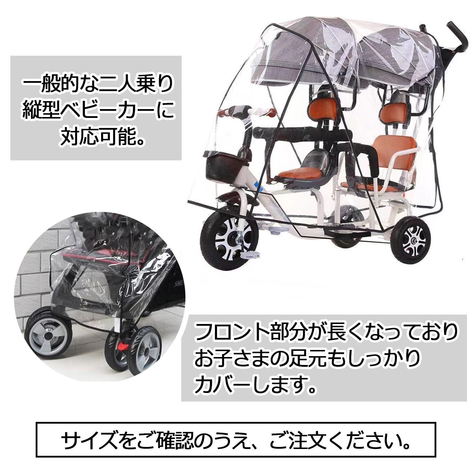 一般的な二人乗り縦型ベビーカーに対応可能。フロント部分が長くなっており、お子さまの足元もしっかりカバーします。サイズをご確認のうえ、ご注文ください。