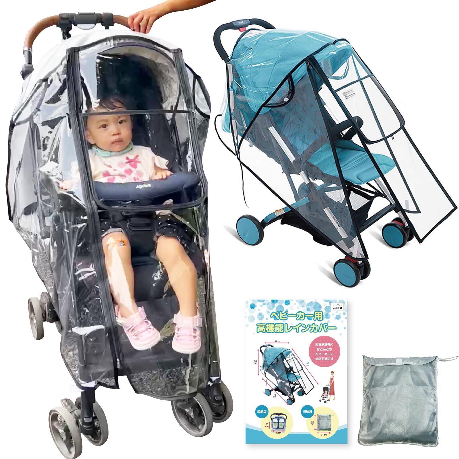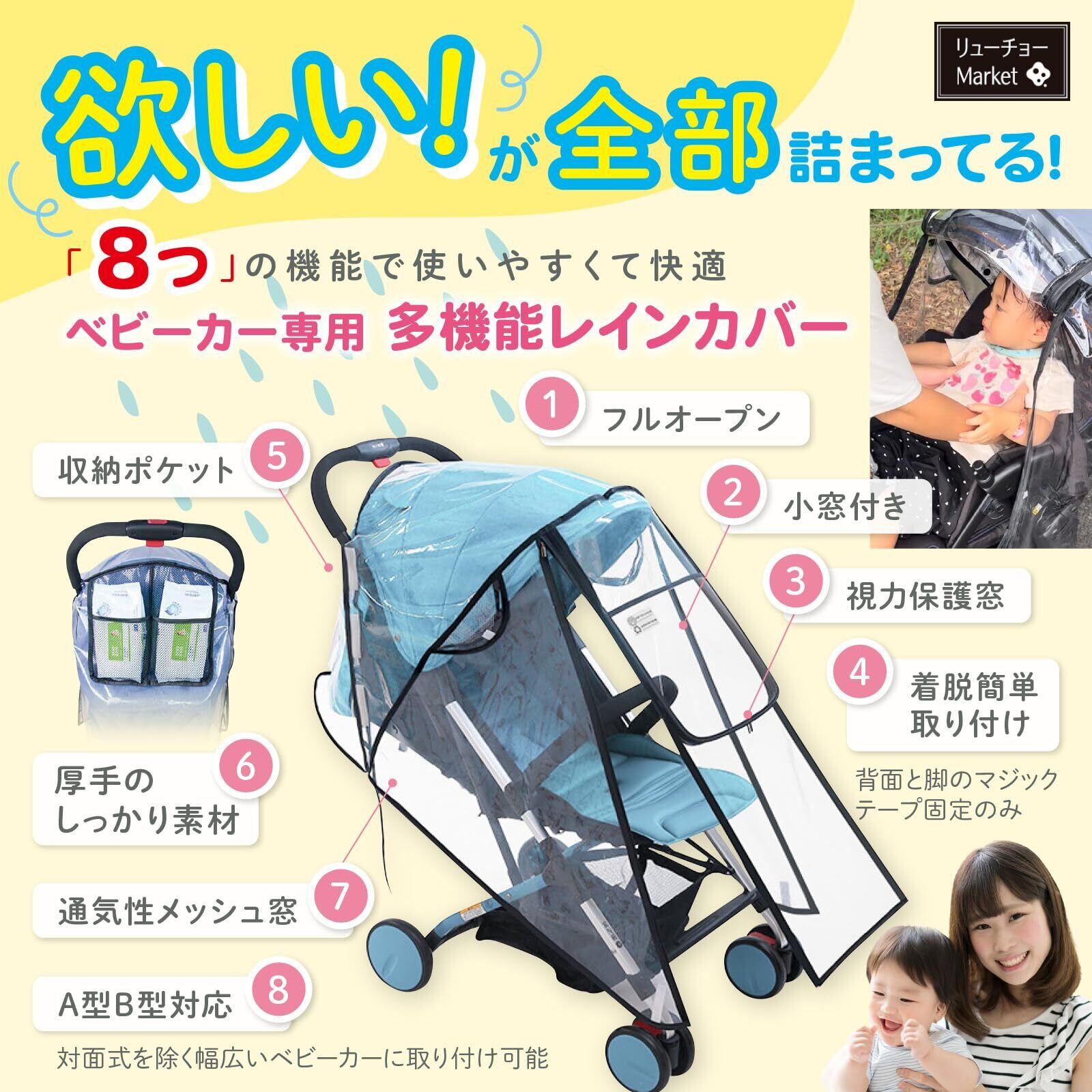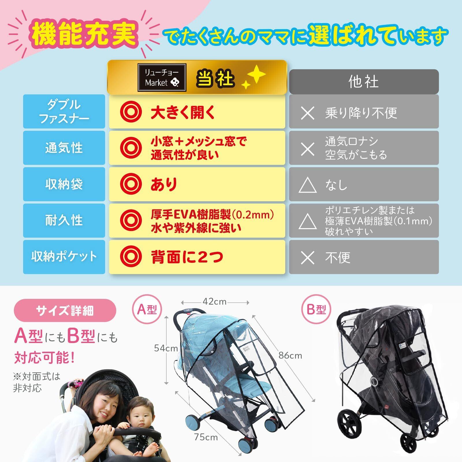 【2022最新】RYUCHO ベビーカー レインカバー フロントオープン A型 B型 収納ポケット 収納ポーチ ダブルファスナー 簡易レインカバー