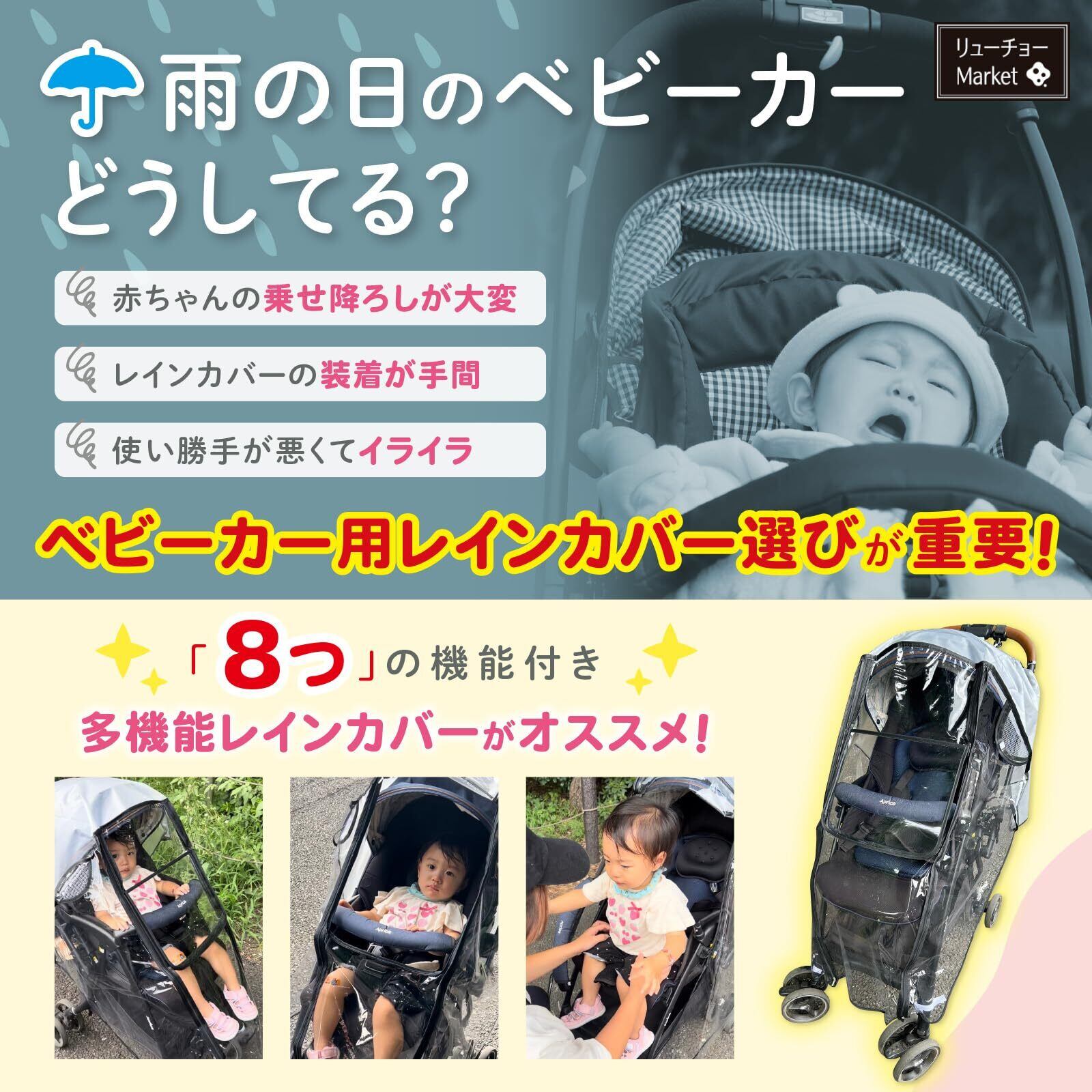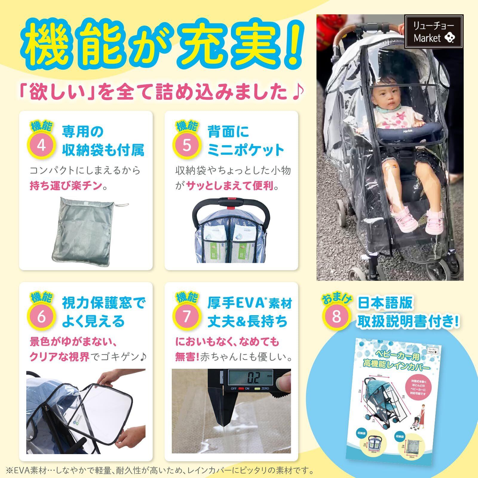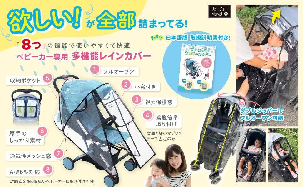 【2022最新】RYUCHO ベビーカー レインカバー フロントオープン A型 B型 収納ポケット 収納ポーチ ダブルファスナー 簡易レインカバー