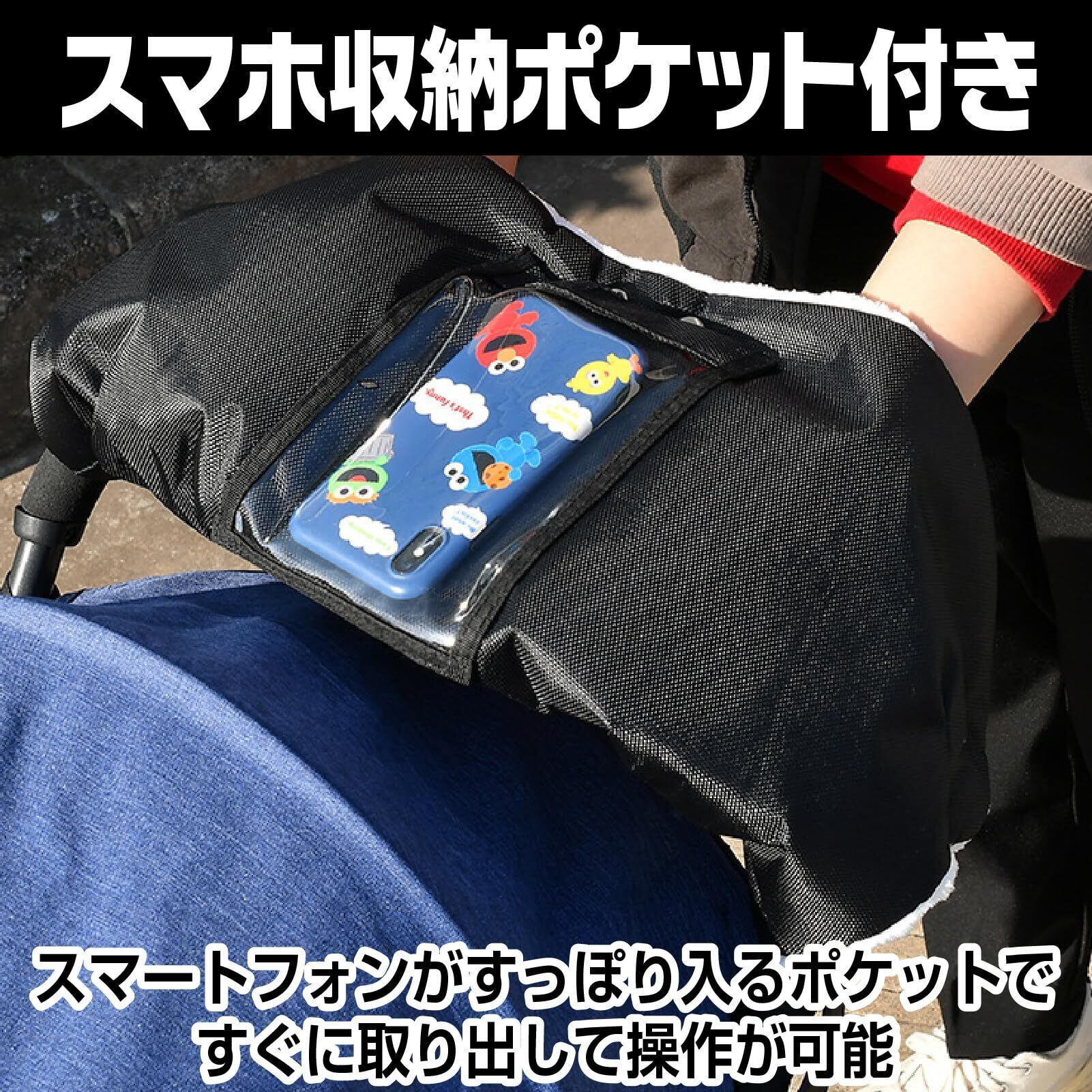 【スマホ収納ポケット付きで便利】 スマートフォンが収納できるポケット付きで、ベビーカーを押しながら地図や連絡先の確認が簡単です。ビニール素材のカバーで保護されているため、スマホ画面の操作も可能。快適に使え、手袋を外す手間も省けます。