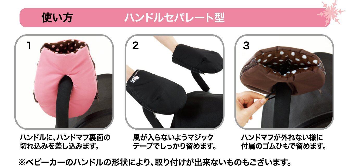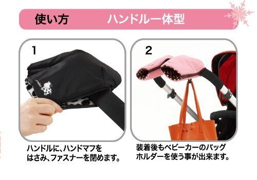 寒い季節のおでかけにとっても便利! ベビーカーに取り付けられるあったかハンドマフです。ベビーカーを押す際に、素手では寒い、手袋だと着脱が大変というジレンマを解消するアイテムです。一体型ハンドル、柄型ハンドルの両方に取り付けることができます。※ハンドルの形状によって、取り付けができないベビーカーもございます。外側は汚れにくい素材になっており、内側はマイクロファイバーでできたボア素材なので肌触りがよく、とても暖かです。内側は、ドット柄または牛柄になっており、ちらっと見えるととってもキュート!