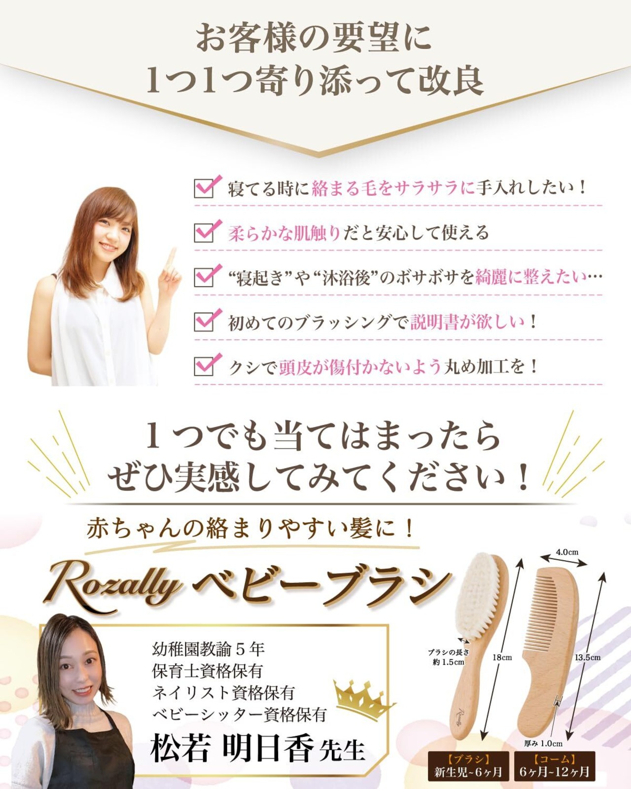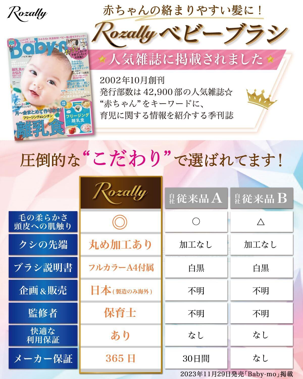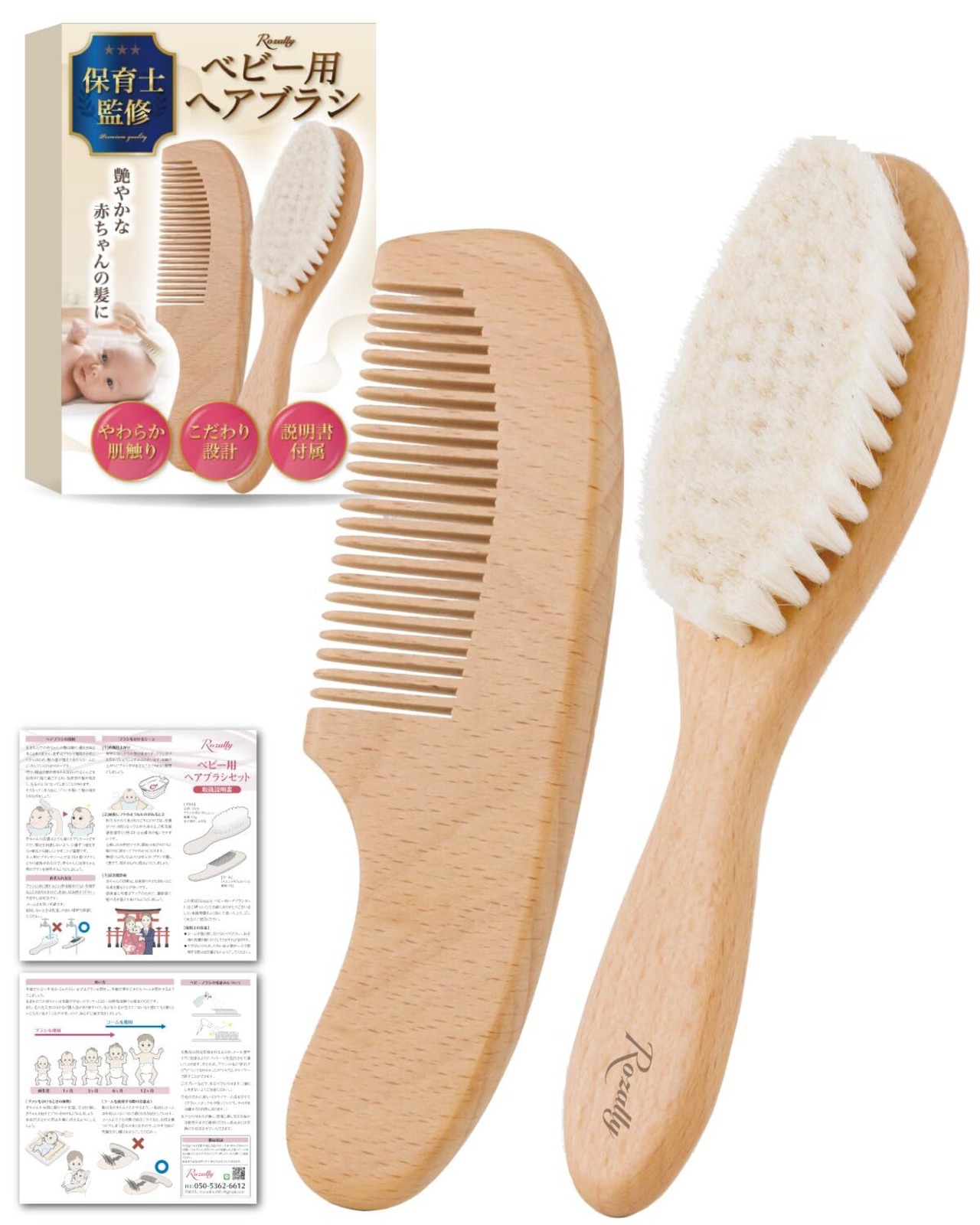 【保育士が監修】 Rozally ベビーブラシ がついに正式販売開始。 赤ちゃん の 髪の毛 がボサボサになる…というお客様の声から生まれた 髪の毛 を さらさら にする ベビー用ヘアブラシ です。 ベビーヘアブラシを使うことで、髪の毛 が 絡まない ように整えることができます。企画&設計では 乳児 や 新生児 の育児に詳しい【保育士】の先生からアドバイスをもらい、 クシ の尖りで頭皮が傷つかないような改良に加え、肌触り の良い「羊毛」と「天然木」を素材として採用致しました。