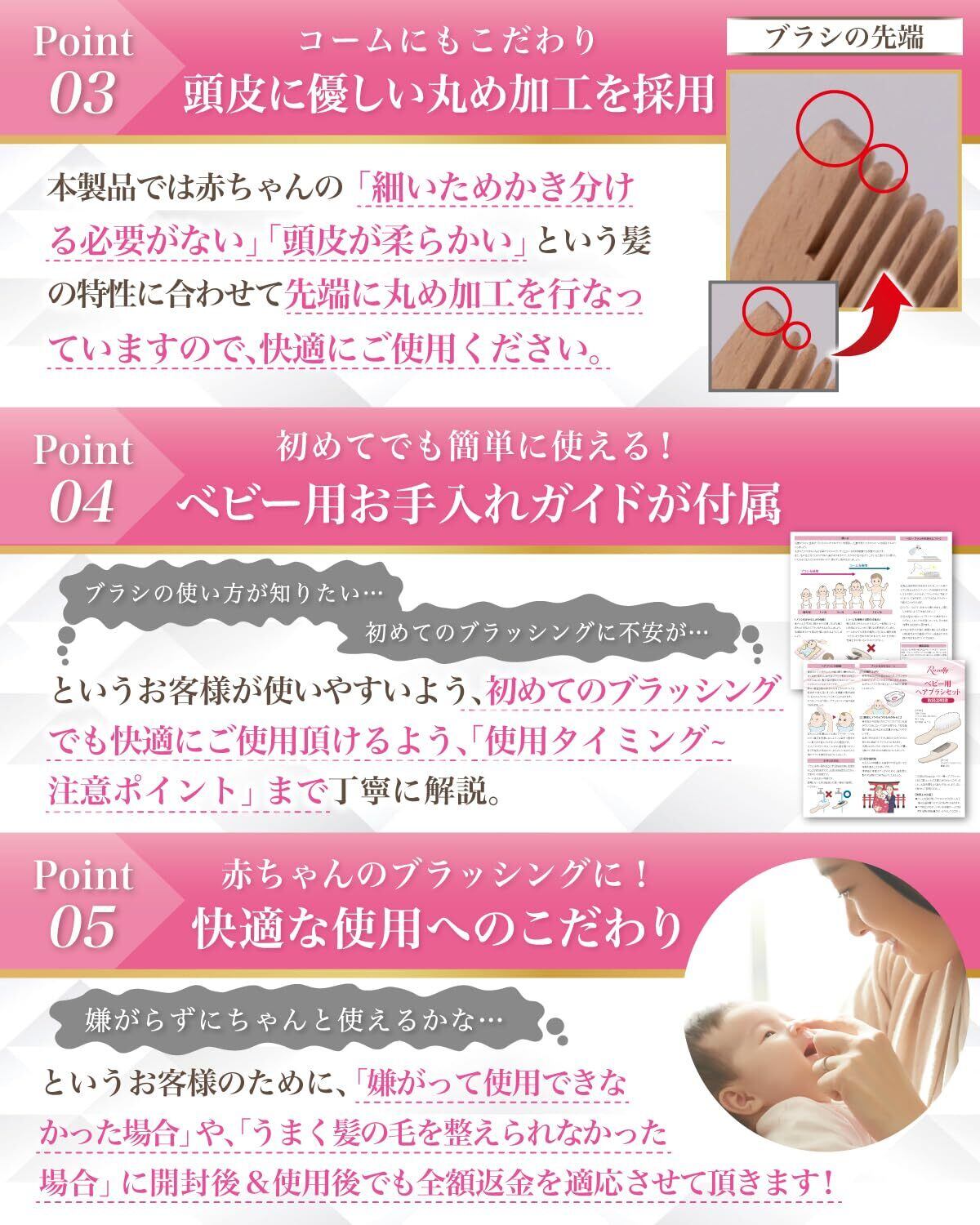 【製品の長期保証】 Rozally ベビーブラシは品質にこだわり、工場と交渉をおこなって素材選定から進めています。出荷前の検品などは十分に行わせて頂いているのですが、輸送中に破損や汚れの付着など稀に発生してしまうケースがあります。不具合などが発生してしまった場合でも、製品には長期保証を付属させて頂いておりますので、すぐに交換品の手配をさせて頂きます。また本製品には使いやすさや快適さを実感して頂くことを最優先に考え、「2週間使ってもうまく髪の毛を整えられなかった」という場合に、”開封後”でも”使用済み”でも全額の返金保証を付属させて頂いております。