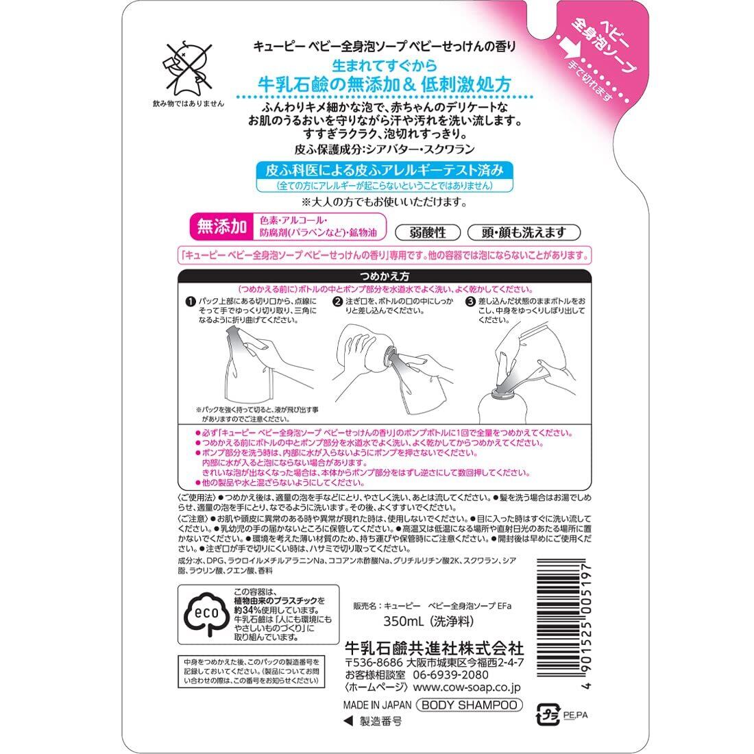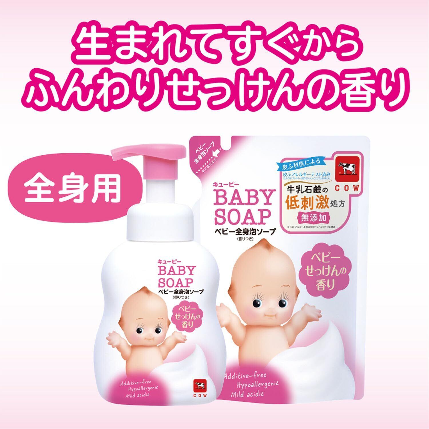 お肌のうるおいを守る皮ふ保護成分「スクワラン」&「シアバター」を配合。ふんわりキメ細かな泡が、皮脂を落としすぎずデリケートなお肌をやさしく洗います。目にしみにくく、泡切れすっきり。顔にも体にも使えます。弱酸性・低刺激・無着色・微香性。ふんわりやさしい、牛乳石鹸「ベビーせっけん」の香りです。皮ふアレルギーテスト済み。泡で出てくるで使いやすく、デリケートな赤ちゃんのお肌のうるおいを守るやさしい全身洗浄料です。