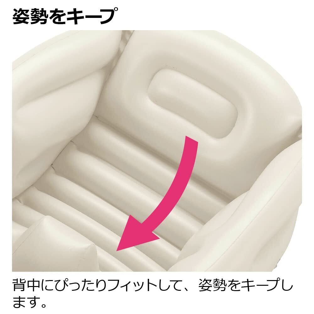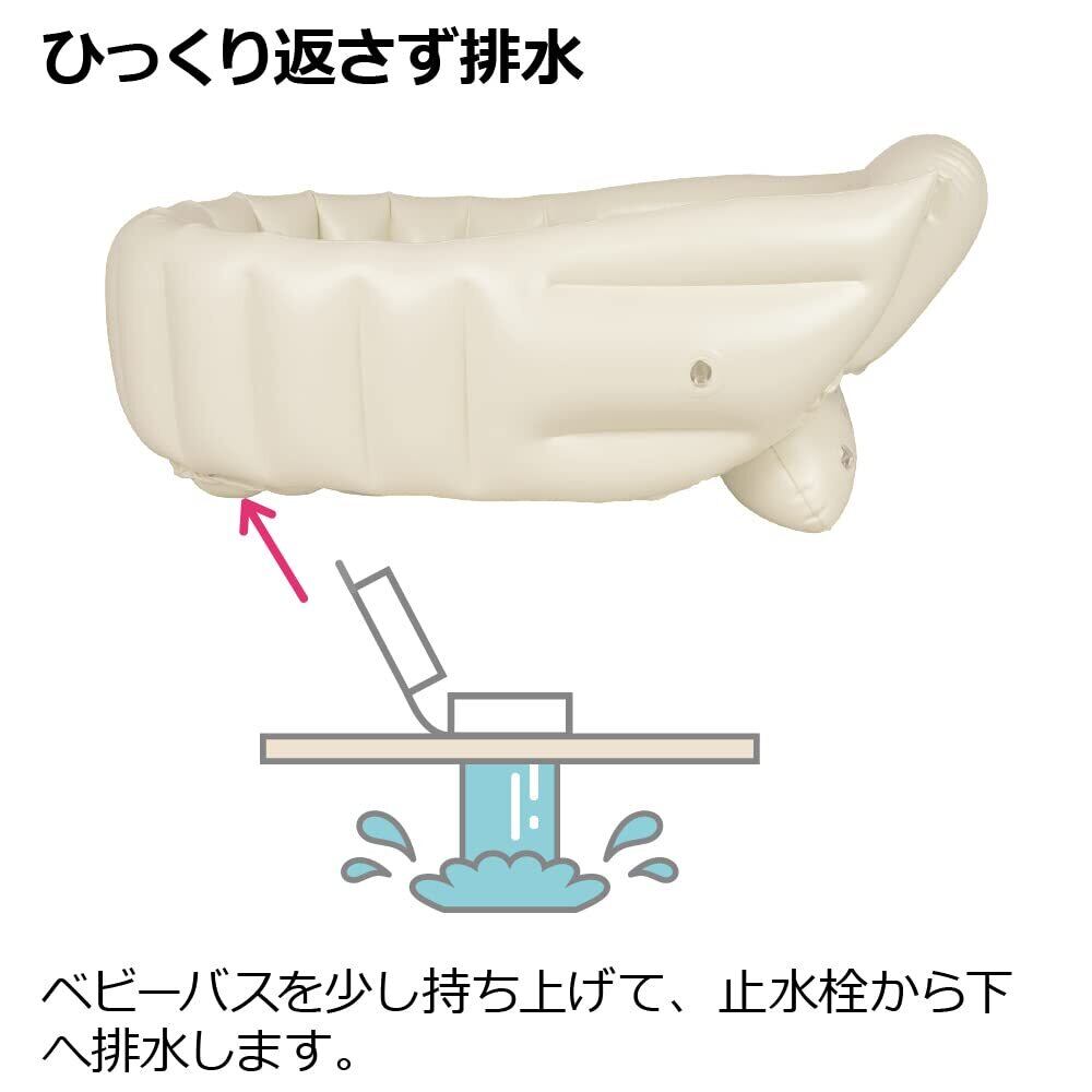 ストッパーが赤ちゃんのずり落ちを防ぎます。背中にぴったりフィットして、姿勢をキープします。腕にやさしい横空気層と、丈夫な縦空気層のWエア構造です。座った体勢がつらいときは、シンクでも沐浴できます。