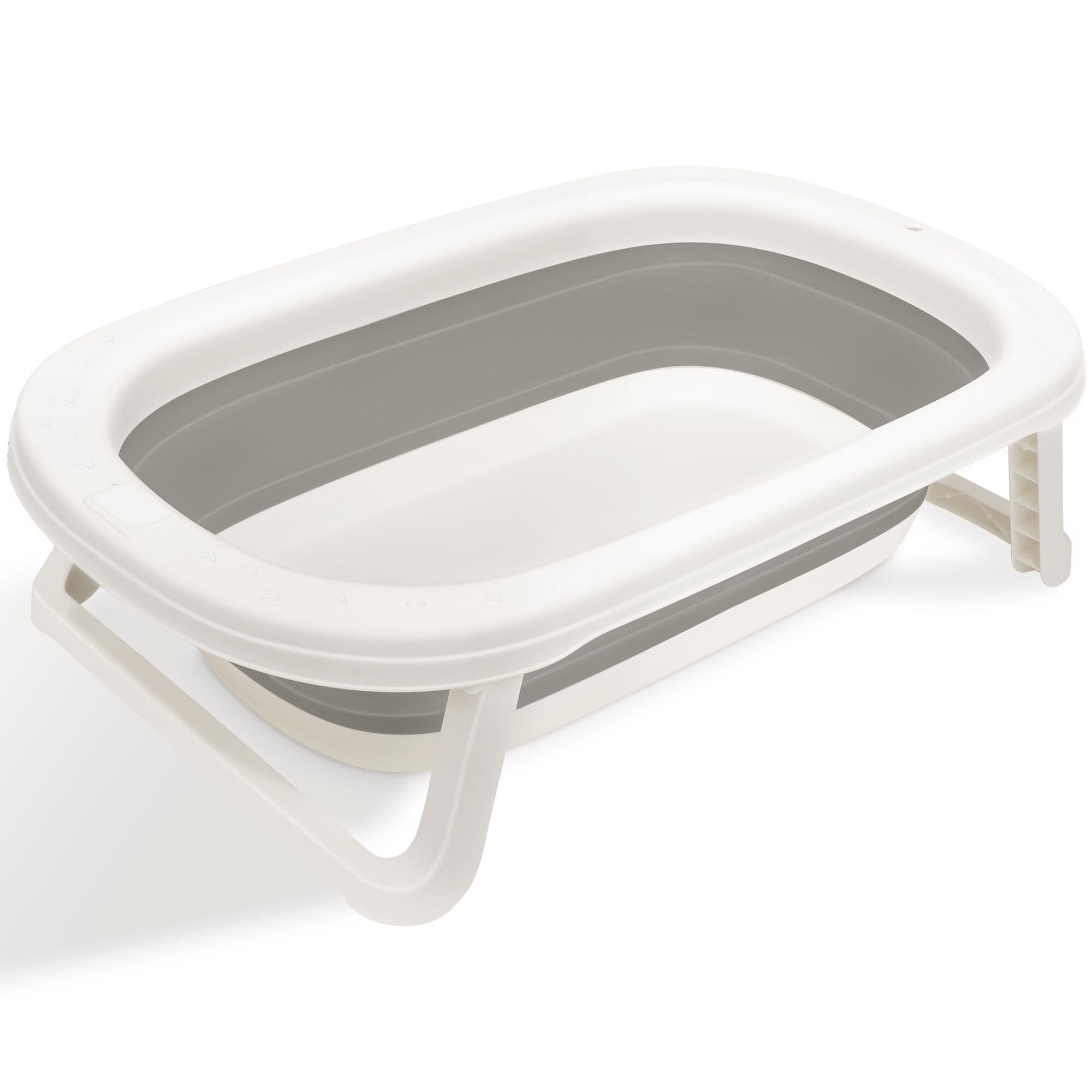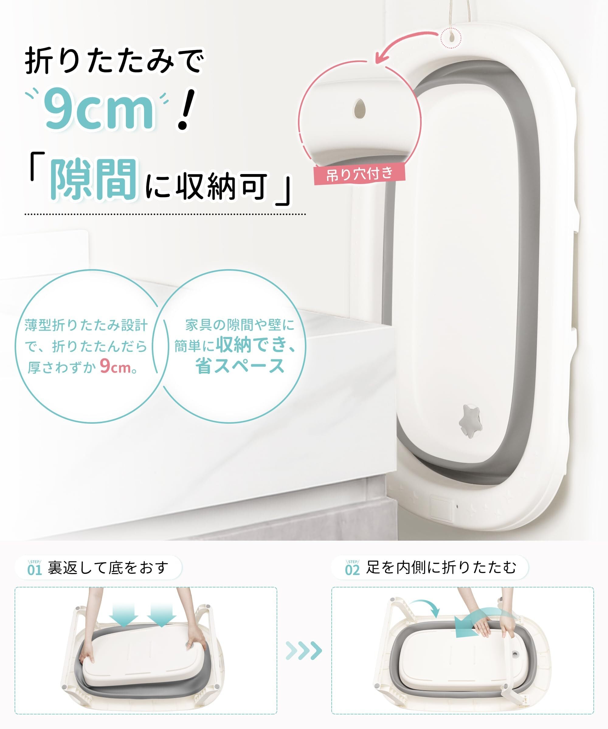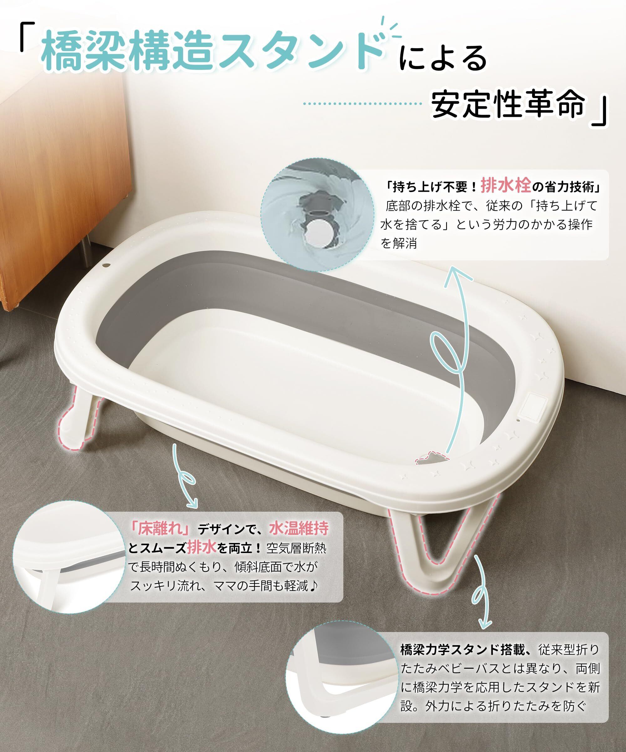 【驚異的 9cm 折りたたみ!抗菌証明付】 チチロバ(Titiroba) ベビーバス 折りたたみ 赤ちゃん 沐浴 犬猫 お風呂 抗菌 環境に優しい 大型 バケツ コンパクト 水抜栓付き スタンド付き 出産祝い 30L (グレー×ホワイト)