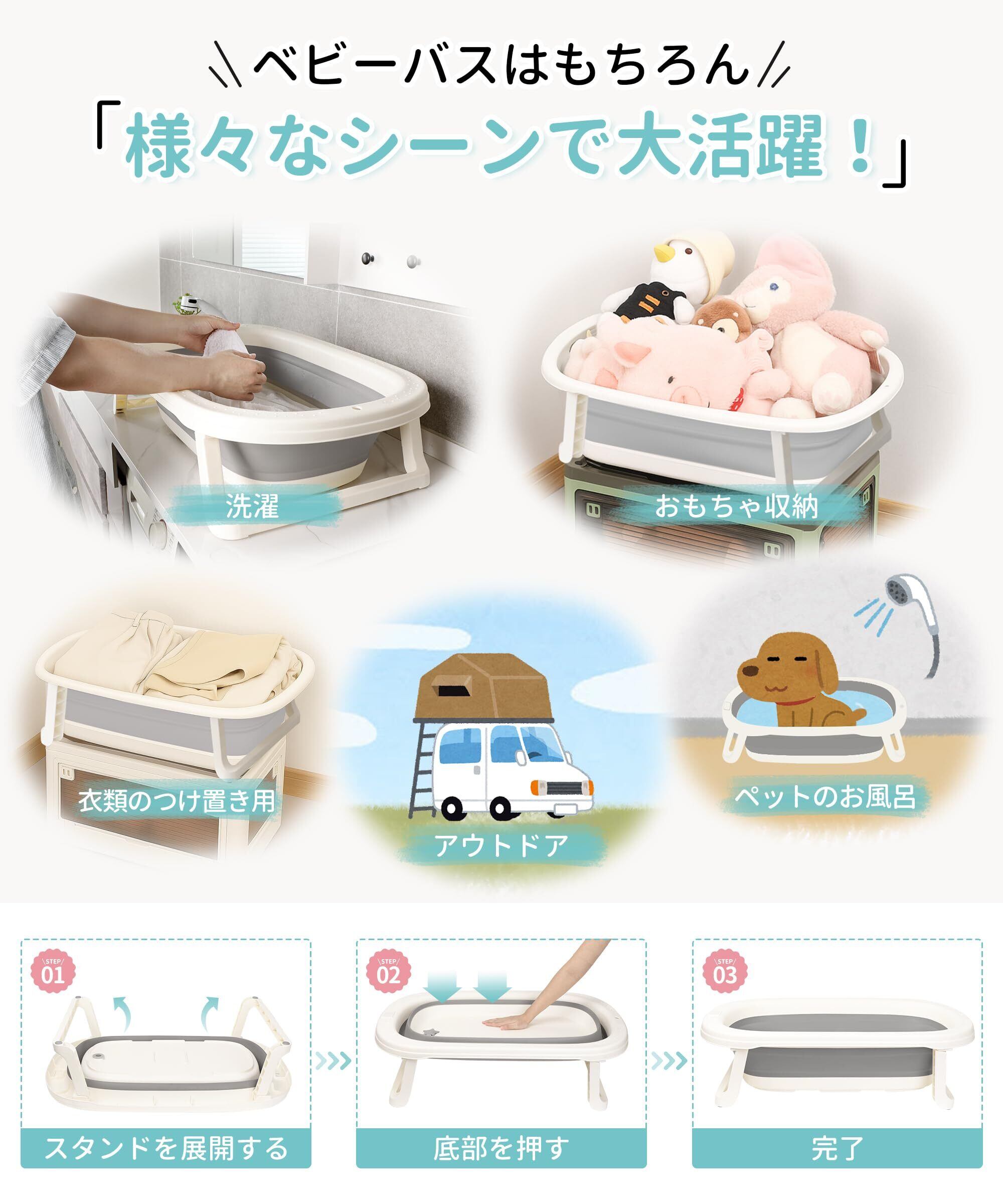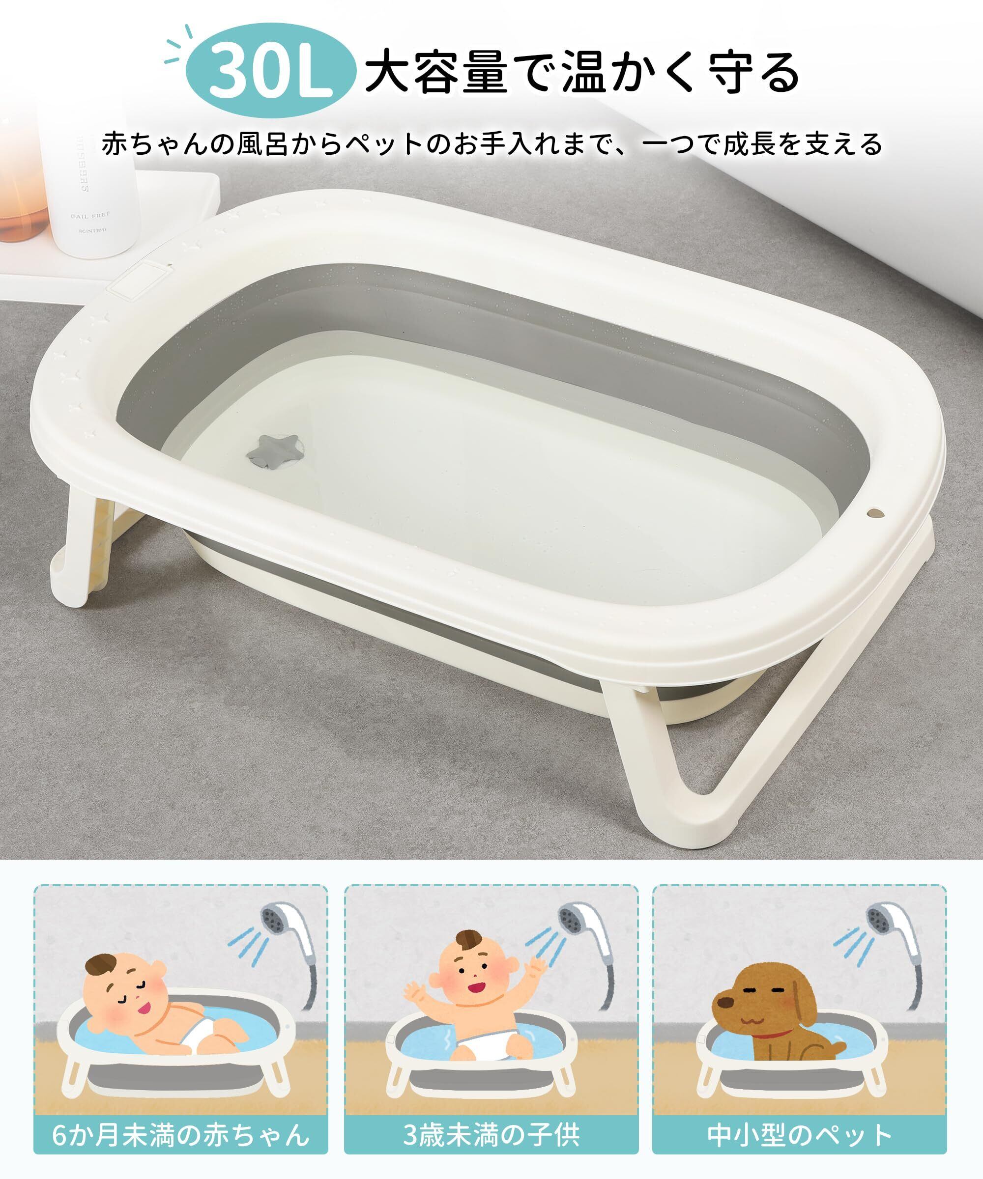 【30L 大容量 × 空気層断熱】ベビーバスはもちろん、洗濯物の浸け置き、おもちゃ収納、ペットのお手入れなど幅広いシーンで活躍。空気層断熱で長時間保温可能。