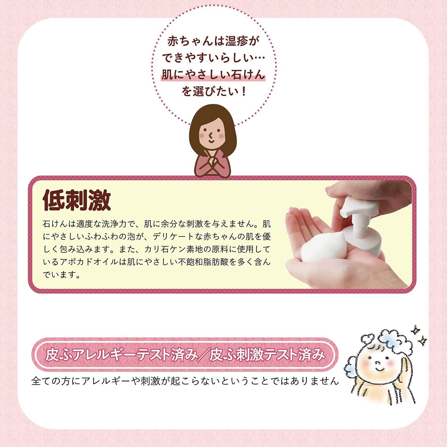お肌に異常のある時や合わない時(赤み、かゆみ、刺激等)には、ご使用をおやめください。ポンプを押す時や使用中に目に入らないよう注意し、目に入った場合はこすらず、すぐに水で充分洗い流してください。誤飲に注意してください。万一飲み込んだ場合は、水を飲ませる等の処置をしてください。いずれの場合も、異常が残る場合は専門医に相談してください。子供の手の届く所に置かないでください。※保存の際は高温、直射日光のあたる場所を避け、開封後はお早めにご使用ください。※低温で白濁したり、変色することがありますが、使用上問題ありません。※必ず「ベビーソープ泡タイプつめかえ用」をつめかえに使用してください。他のものを入れると、泡にならない/ポンプが機能しないなどの問題が生じる可能性がございます。