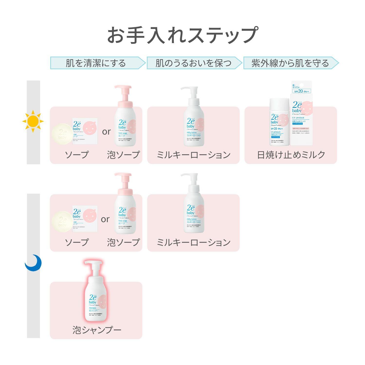 赤ちゃんのためのスキンケア。赤ちゃんの頭皮のうるおいを守りながら、汚れをすっきり落とすシャンプー。