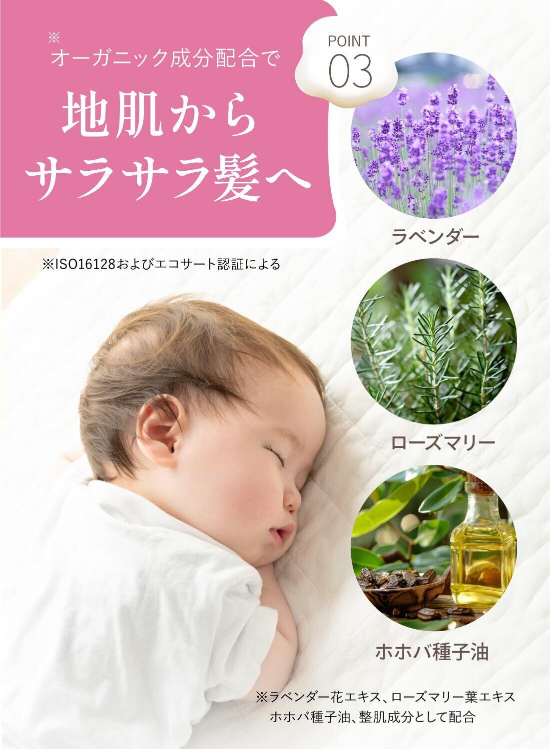 【地肌を清潔に保つオーガニック成分配合】ラベンダー、ローズマリー、ホホバ種子油を配合。地肌や髪を清潔な状態に保ち、乾燥を防ぎます。健やかな髪の土台となる、地肌をケアして、サラサラ髪へ。