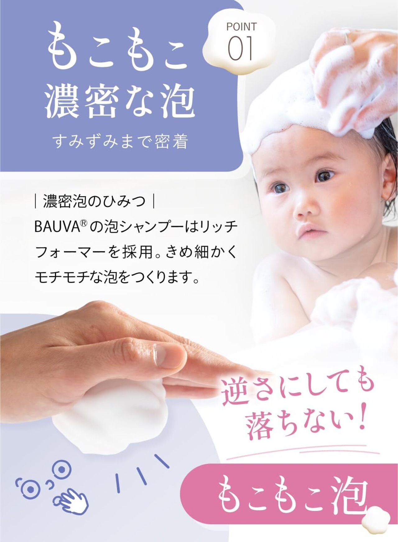 【アミノ酸系×植物由来 Wの洗浄成分がやさしくスッキリ】実は赤ちゃんの汗の量は大人の2倍近く。地肌が汚れた状態だと雑菌が繁殖し、におい、ブツブツ、かゆみの原因に。バウバ ベビー泡シャンプーは、Wの洗浄成分配合。植物由来成分が汚れを浮かし、アミノ酸系成分が発泡力でもれなく汚れをを落とします。
