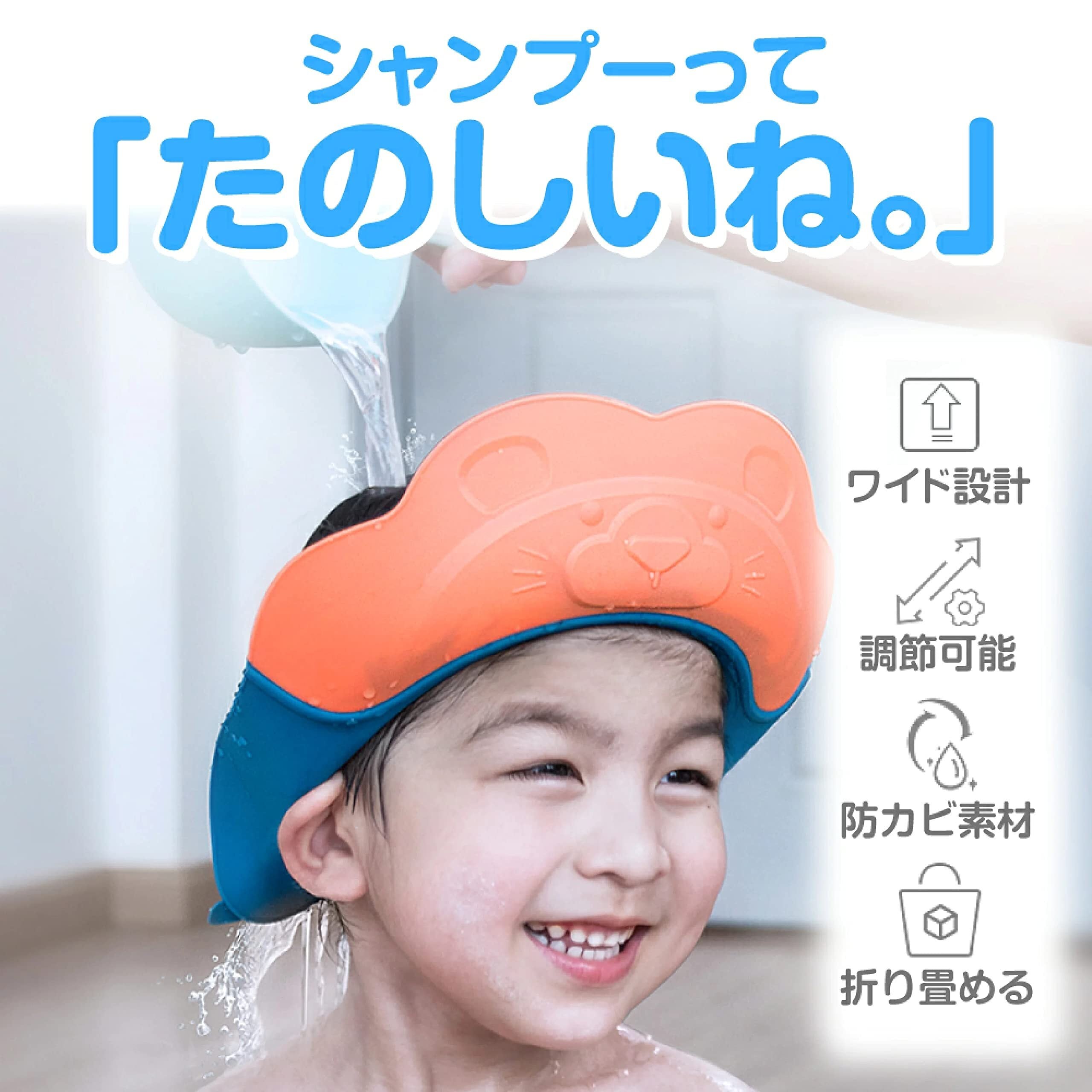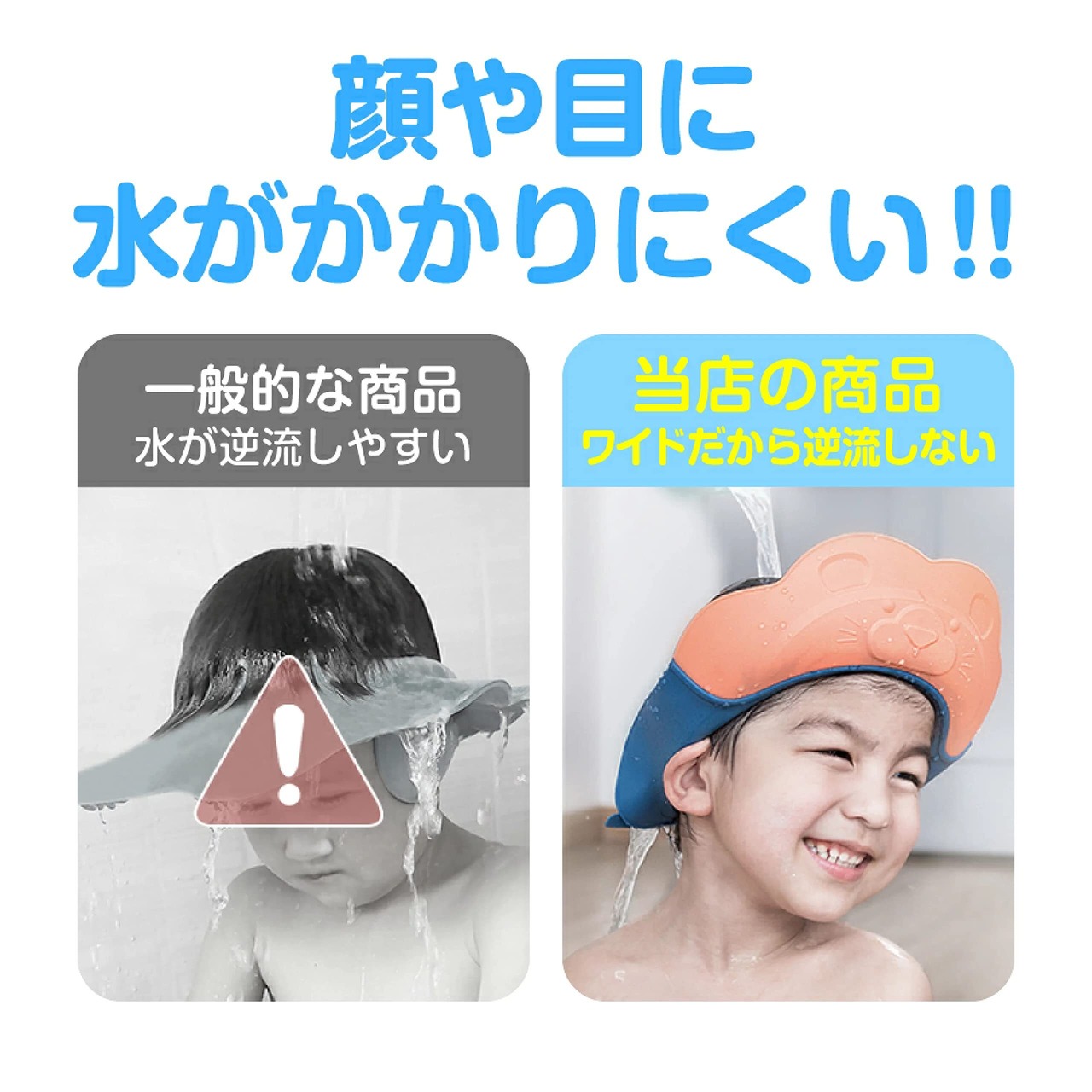 【逆流しない設計】後ろから排水する設計なので、お子様の耳やお目目に水がかからず!お子様もママパパもしっかり安心。つば部分には、強度のあるPP素材を使用しているのが特徴です。頭囲にしっかりフィートする立体設計で頭に触れる部分にはソフトシリコンを採用し、頭の大きさに合わせた細かなサイズ調節もお手軽に。