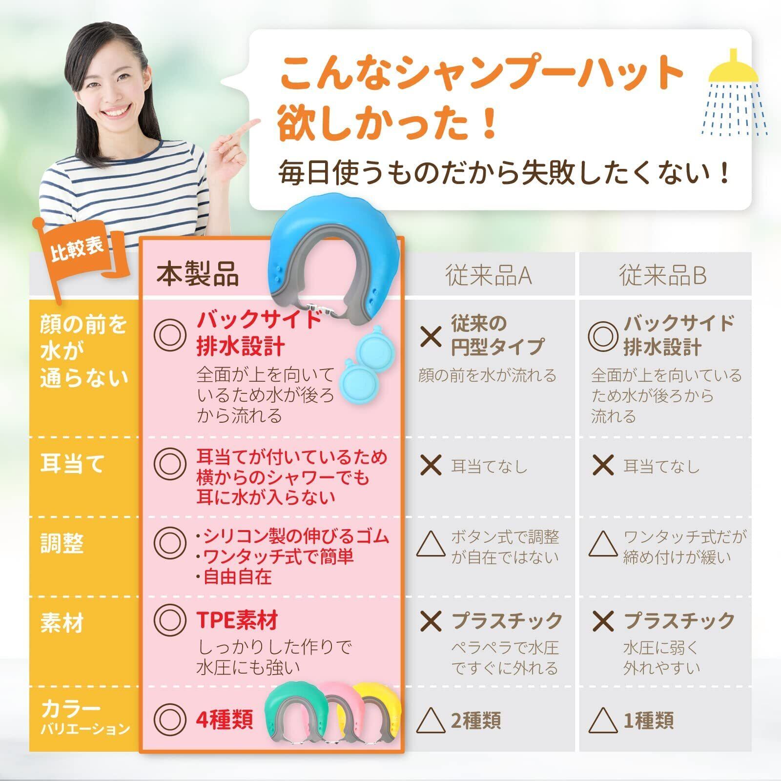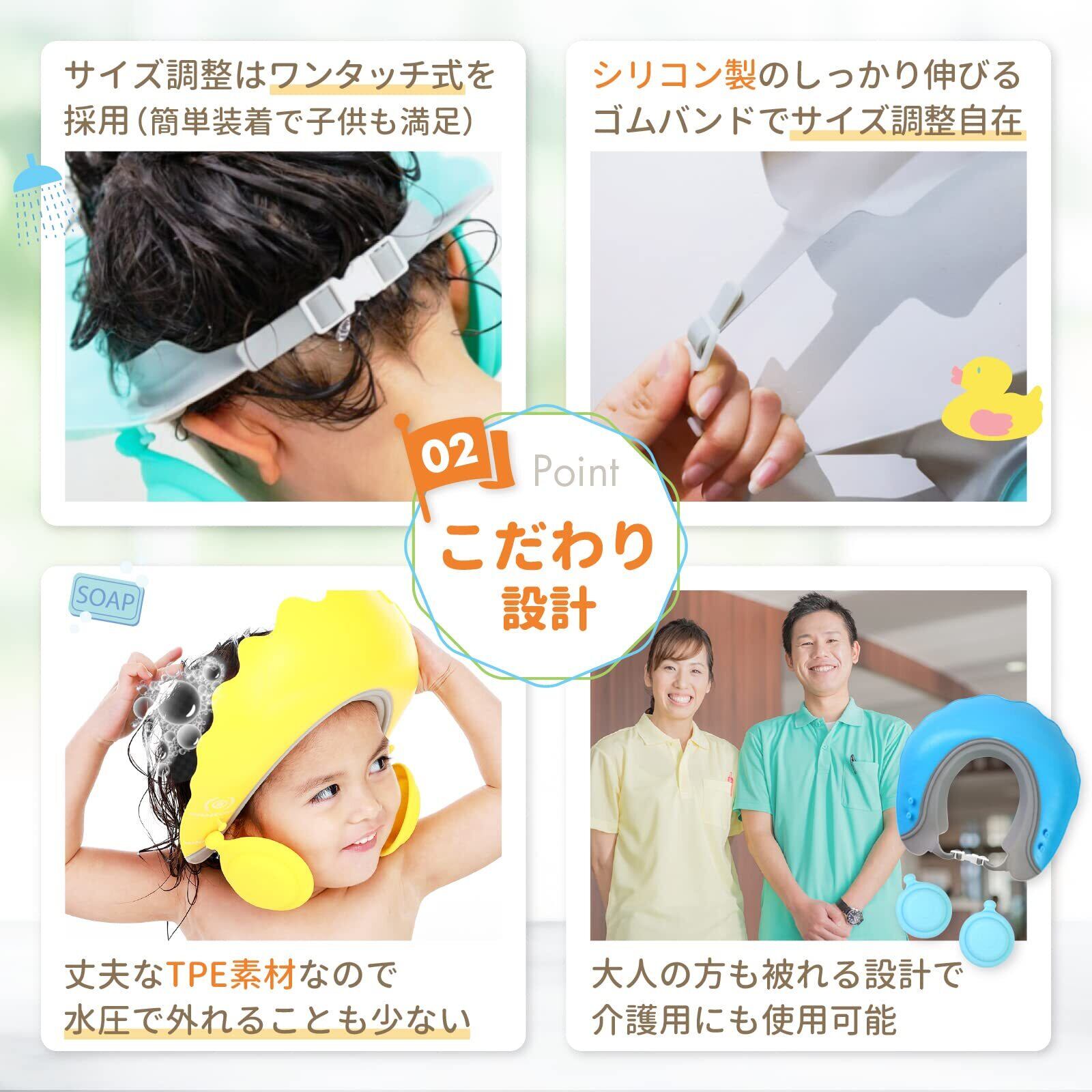 【丈夫な素材を使用】丈夫なTPE素材で作られていて、厚みもしっかりあるので、水圧でへこたれる心配もありません。体との接着部はシリコン製で肌に優しく水が漏れる事もありません。 【顔と耳が濡れない】顔の前に水が流れないバックサイド排水設計を採用しており、水が怖いお子さんでも安心して使用頂けます。また2段階で位置を調整出来る耳当ても付いていて耳の中に水が入る心配もありません。