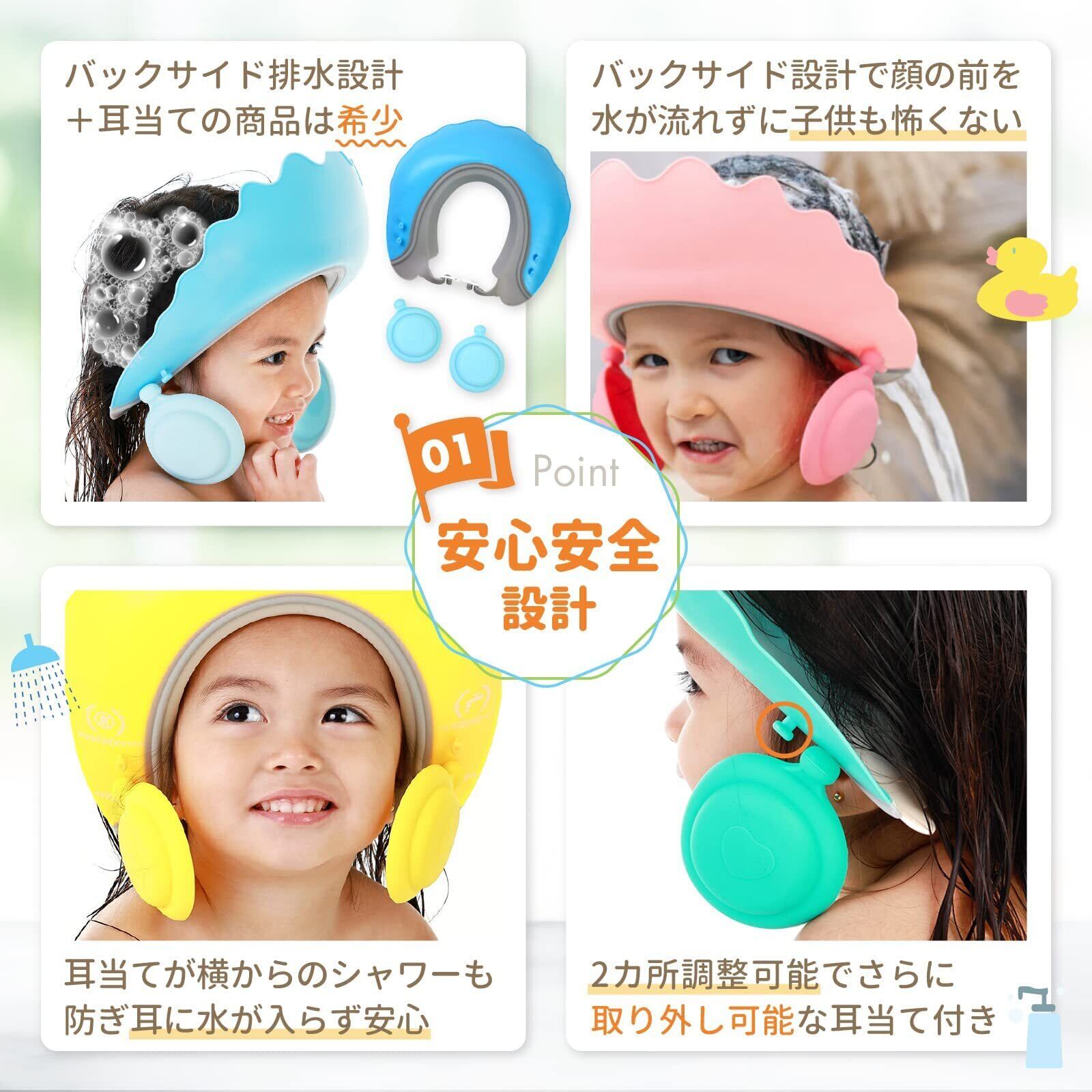 【顔と耳が濡れない】顔の前に水が流れないバックサイド排水設計を採用しており、水が怖いお子さんでも安心して使用頂けます。また2段階で位置を調整出来る耳当ても付いていて耳の中に水が入る心配もありません。
