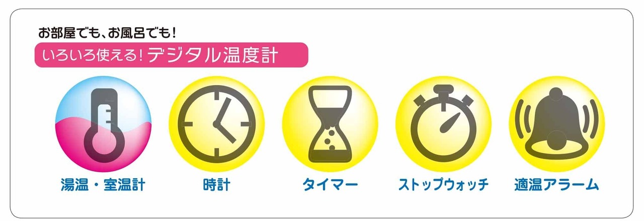 また湯温計・室温計の他にも、時計、タイマー、ストップウォッチ、適温アラームの4つの機能が付いています。