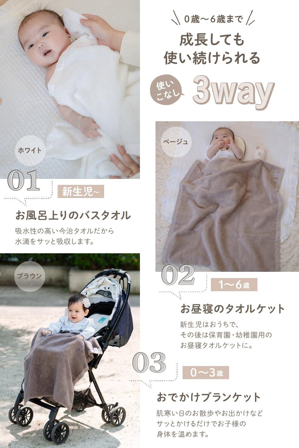 新生児 から6歳まで使える 今治タオル ベビータオル 0歳は 湯上りタオル やお昼寝の ブランケット として。また 保育園 幼稚園 用のお昼寝 ブランケット としてもお使い頂けます。 ※whip whipシリーズのベビーバスローブとタオル生地は異なります。予めご了承ください。