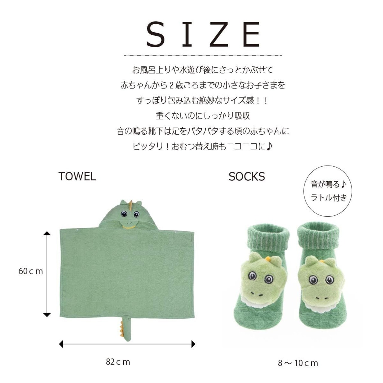 音 の鳴る ソックス と かわいい 動物 の フードバスタオルがセットになっています。