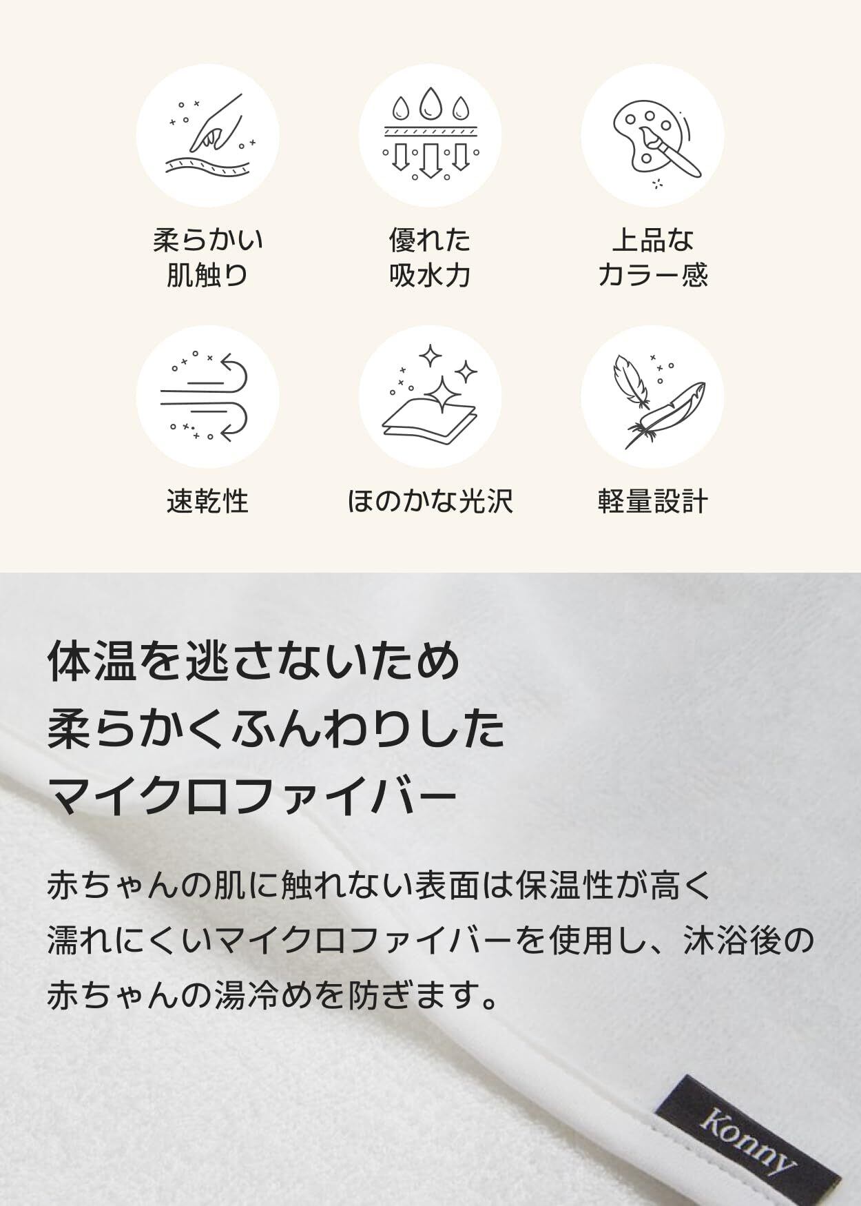 【優れた吸水力】体温を逃さないため柔らかくふんわりしたマイクロファイバーの二重生地を使用し、赤ちゃんの肌に触れない表面は保温性が高く濡れにくいマイクロファイバーを使用し、沐浴後の赤ちゃんの湯冷めを防ぎます。