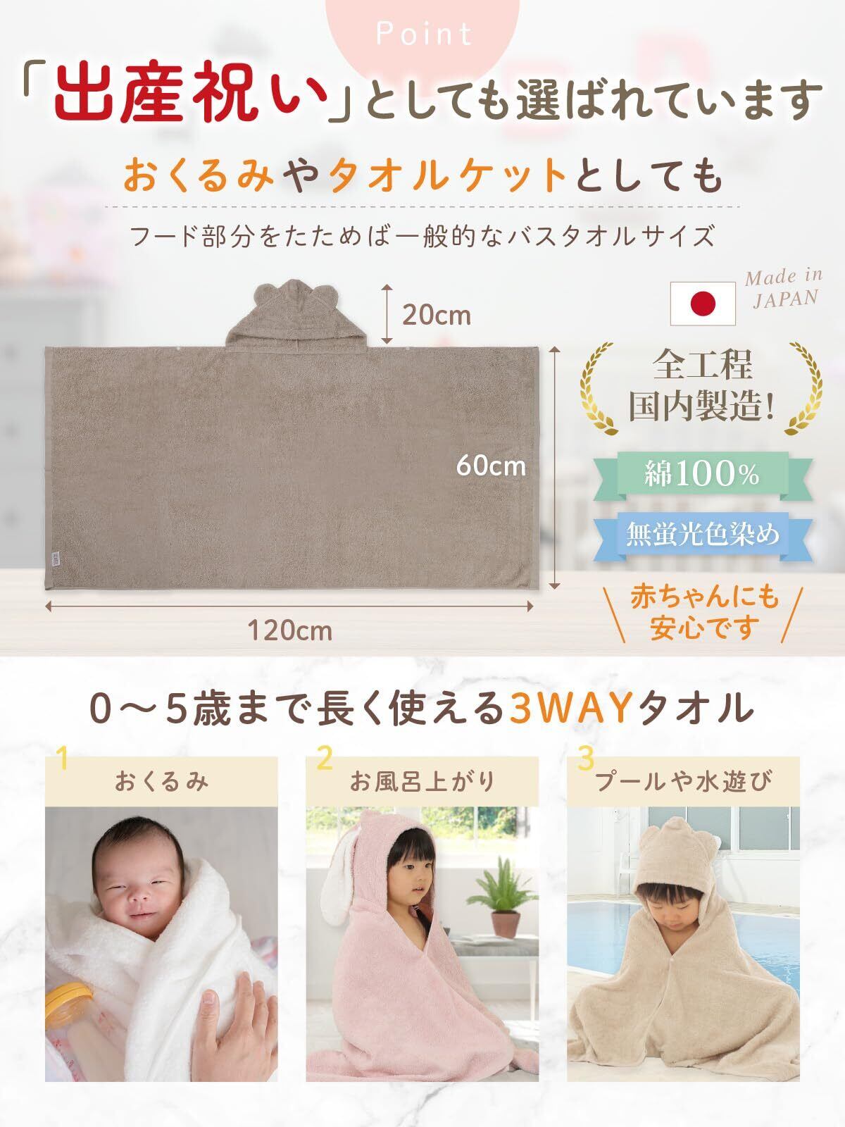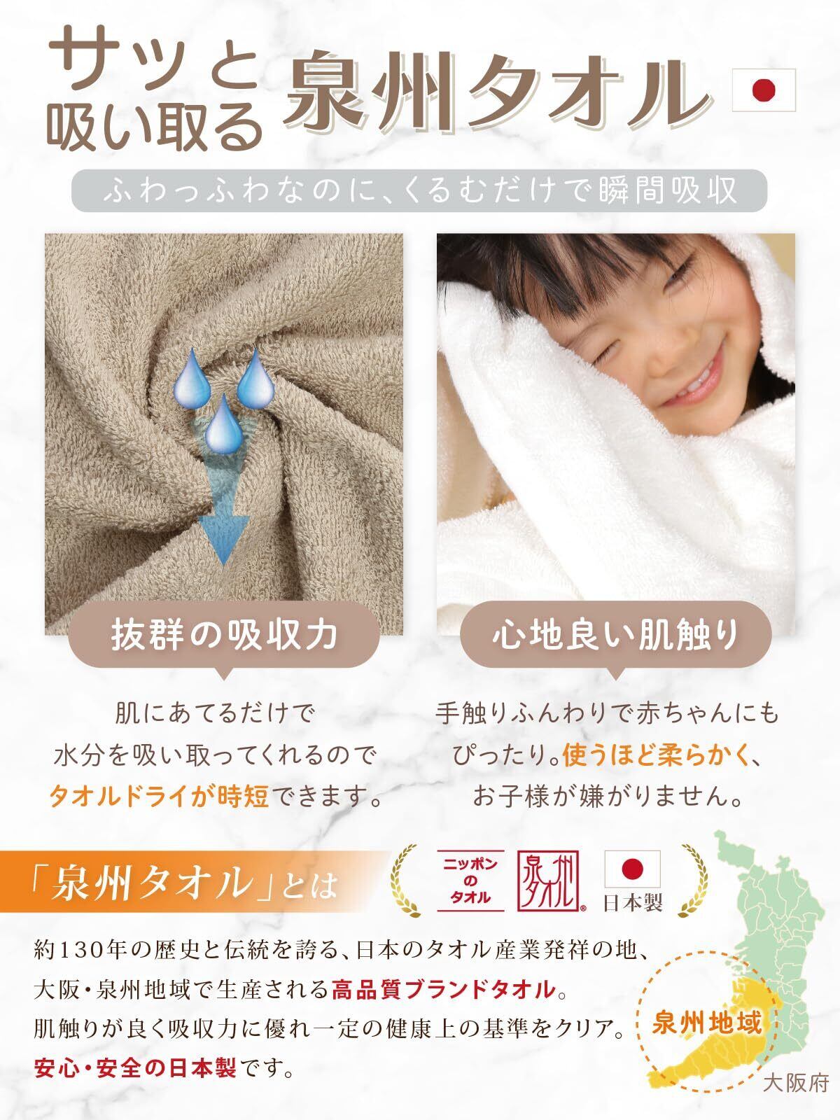 【成長してもずっと使える】0歳:おくるみ、1歳~:お風呂あがりの湯冷め防止に、3歳~:プールタオル、とお子さんも成長に合わせて長く使用できますサイズは他のタオルと一緒なので保管しやすく、洗濯時の乾きやすさと「ふわふわ」を両方兼ね備えた生地の厚さになっています また、タオル生地は無蛍光色で染めていますので赤ちゃんにも安心して使えます【高級ブランドタオル】泉州タオルは日本のタオル産業発祥の地である大阪泉州地域で約130年の歴史があります特徴としては「吸水性」「安全清潔」「ふわふわな肌触り」の3つがあげられます赤ちゃんや肌の弱い方も安心してお使いいただけるのも魅力です 【安心安全の品質】一定の健康上の基準をクリアしており、アレルギーや化学物質の影響が気になる方も安心してご使用いただけます アレルギーの個人差によります【プレゼント用に】とてもかわいいウサ耳クマ耳付きで、出産祝い・誕生日プレゼント等にお勧めです ギフト包装(有料)下記参照 【 ギフト包装の選択】PCギフトの設定にチェックを入れて次に進むスマホレジに進むボタンをタップし、ギフトの設定をタップする