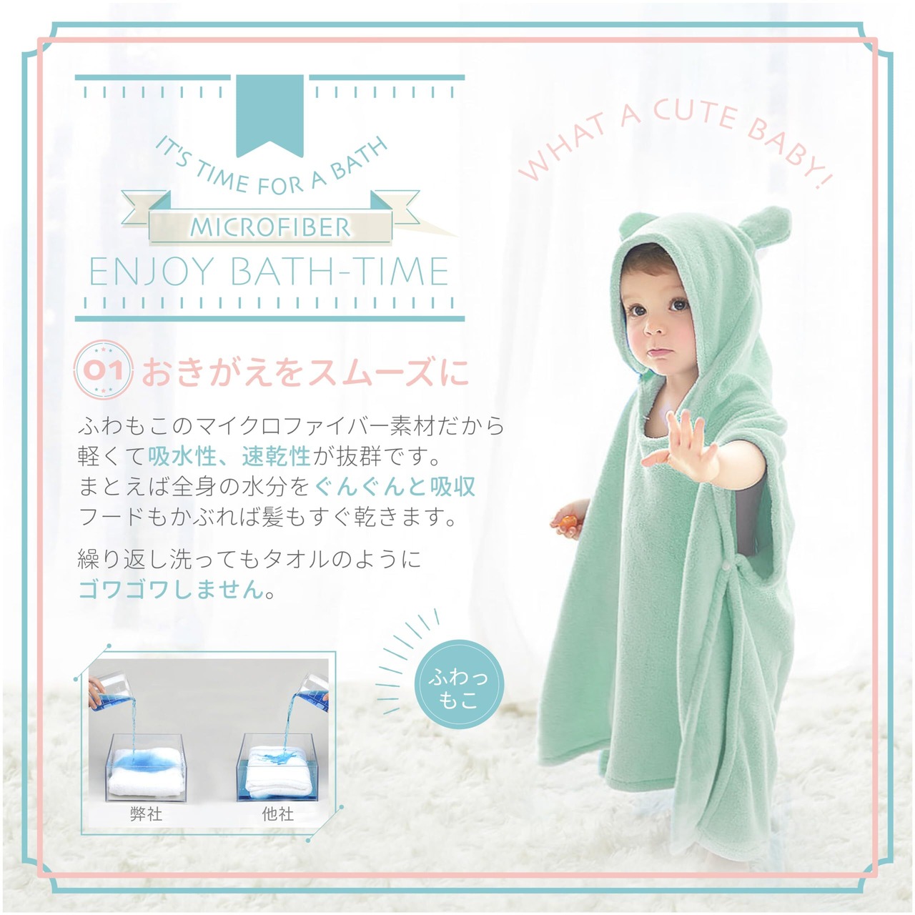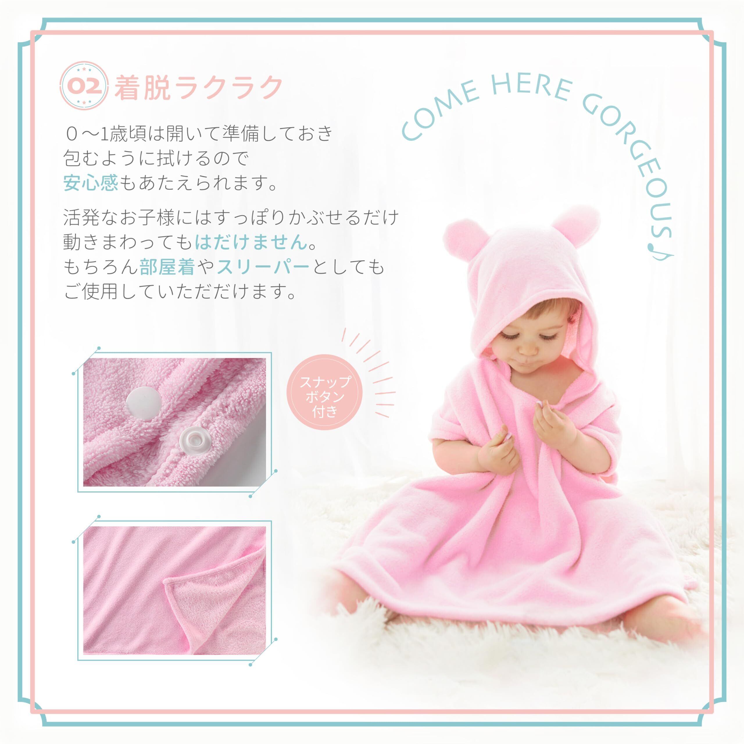 【お風呂あがりの忙しさと不安を解消】「お風呂後の着替えってバタバタ」「一人でこなそうとすると焦って危ないし不安」 体の水分をぐんぐん吸水!お風呂あがりがスムーズになるかわいい耳付き ベビー キッズ バスローブ です。
