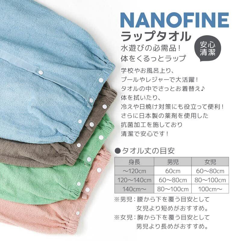 【NANOFINE ラップタオル 80cm✕120cm】大人気!制菌加工「ナノファイン」ラップタオル。おかげさまで、販売枚数40万枚突破!。皆様からご愛顧いただきまして累計販売枚数が400,000枚を突破しました。[日常使うものだからこそ、「清潔」で「使いやすい」「安心できる」ラップタオルを!]制菌力を発揮しながらもお肌に優しい日本製薬剤を使用した制菌加工「ナノファイン」を施しており清潔で安心です。タオルの中でお着替えができる便利なラップタオル。学校やプール、レジャーで大活躍します。簡単に頭からすっぽりかぶれますのでお風呂上りに寒さ対策としても活用できます。スナップボタンで開け閉めできるからお子様でも簡単に使えてラップタオル以外でも、一枚物のタオルとして使用ができます。ちょっとした移動など冷え対策や日焼け防止にも役立つ多機能タオルです。選べるカラーバリエーション:スモークブルー・グレーベージュ・マリングリーン・モスピンク・ラベンダー。是非お気に入りの1枚を見つけてください。