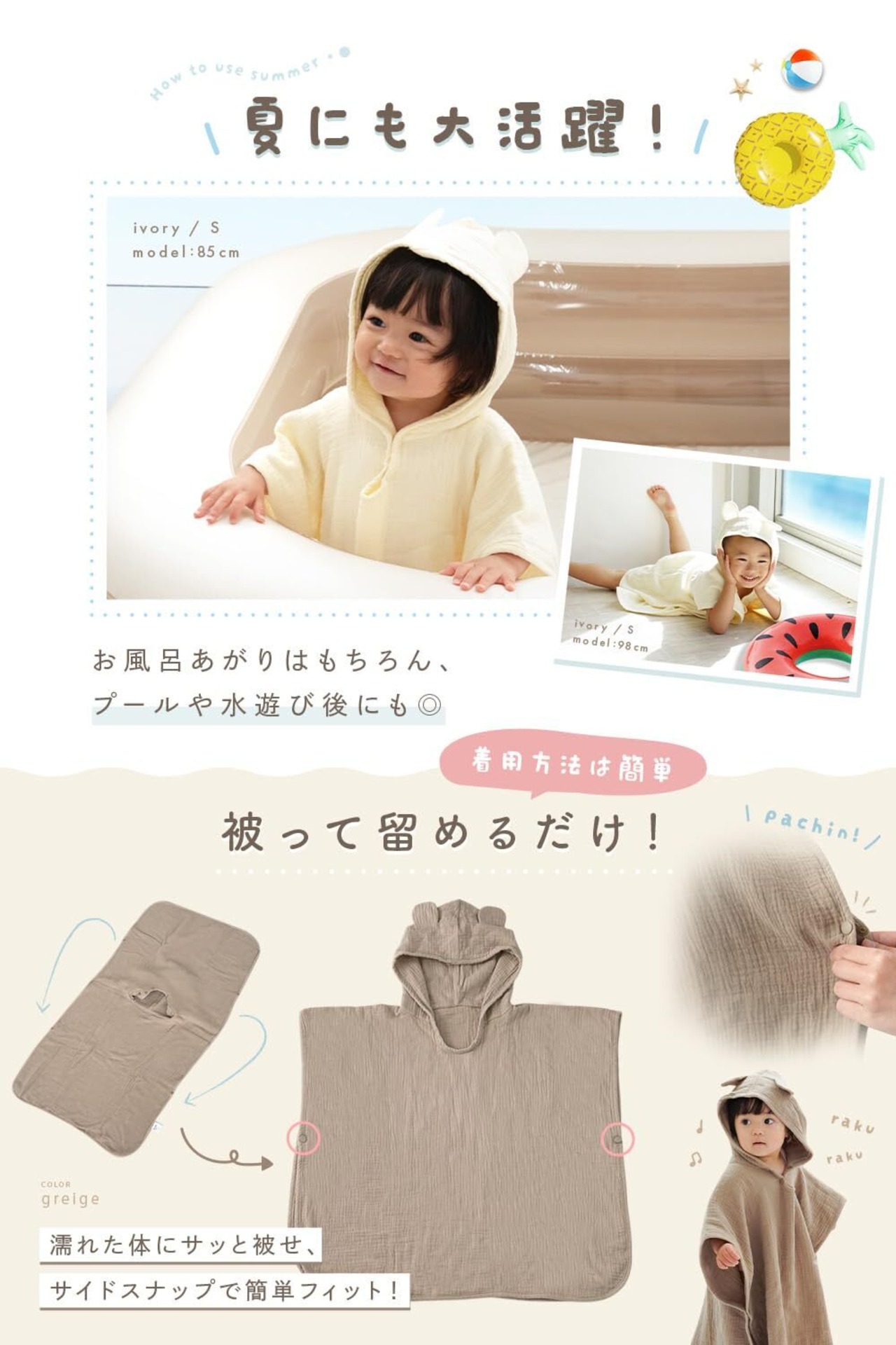 [atRise] 高吸水×速乾≪4重ガーゼ≫フード付きタオル 赤ちゃん ベビーバスローブ 《0歳からOK》綿100% 4重ガーゼ S/Mサイズ 出産祝い/プレゼントにも タオルポンチョ ワンオペ お風呂 プール