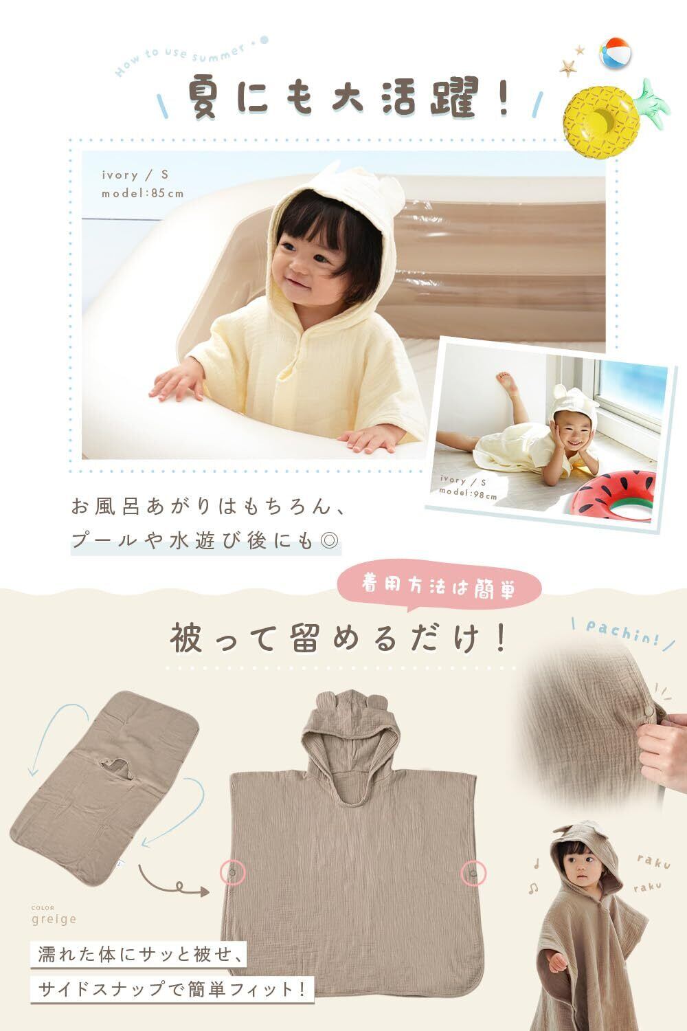 【毎日のお風呂上がりを、もっとスムーズに】ふんわり軽い4重ガーゼで仕立てた、atRiseのベビーバスローブ。 吸水性にすぐれたガーゼが、お風呂や水遊びのあとの水分をサッと吸収。フード付きタオルのように使える1枚で、頭からかぶせるだけ。忙しいワンオペ育児でもお風呂あがりのバタバタを軽減してくれます。くま耳付きのキュートなシルエットは、写真映えもばっちり。子育てを楽しむすべての人に寄り添う atRise のベビー バスローブです