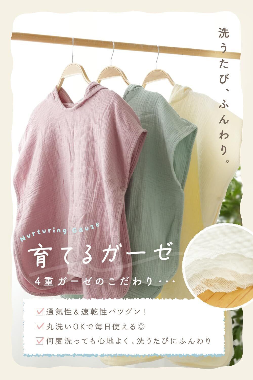 【“育てるガーゼ”で、洗うほどふんわり。毎日使いたくなる心地よさ】使うたび、洗うたびにふわっとやわらかくなる“育てるガーゼ”。空気をたっぷり含んだ4重構造が、繊細なお子さまの肌をふんわりと包みこみます。通気性・速乾性にもすぐれているから、夜に洗って朝には乾いているほど。毎日気兼ねなく使えて、洗濯機で丸洗いできる手軽さも、ワンオペ育児の強い味方。「乾いてないから今日は使えない…」そんな心配も少なく、忙しいお風呂タイムをグッと快適にしてくれます◎