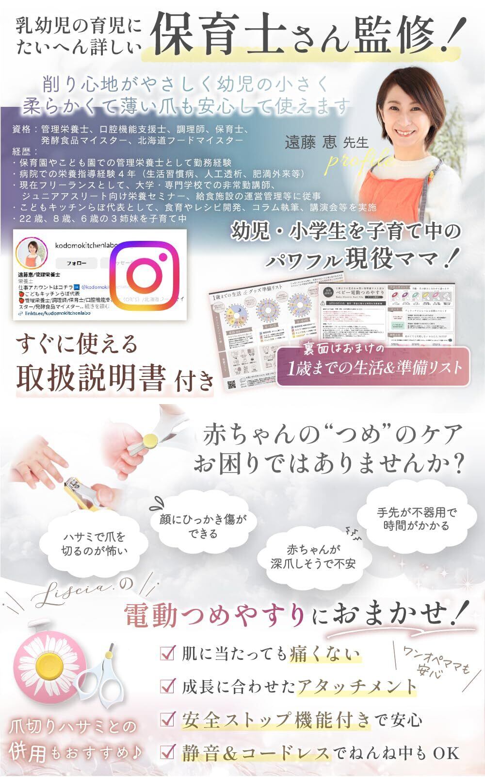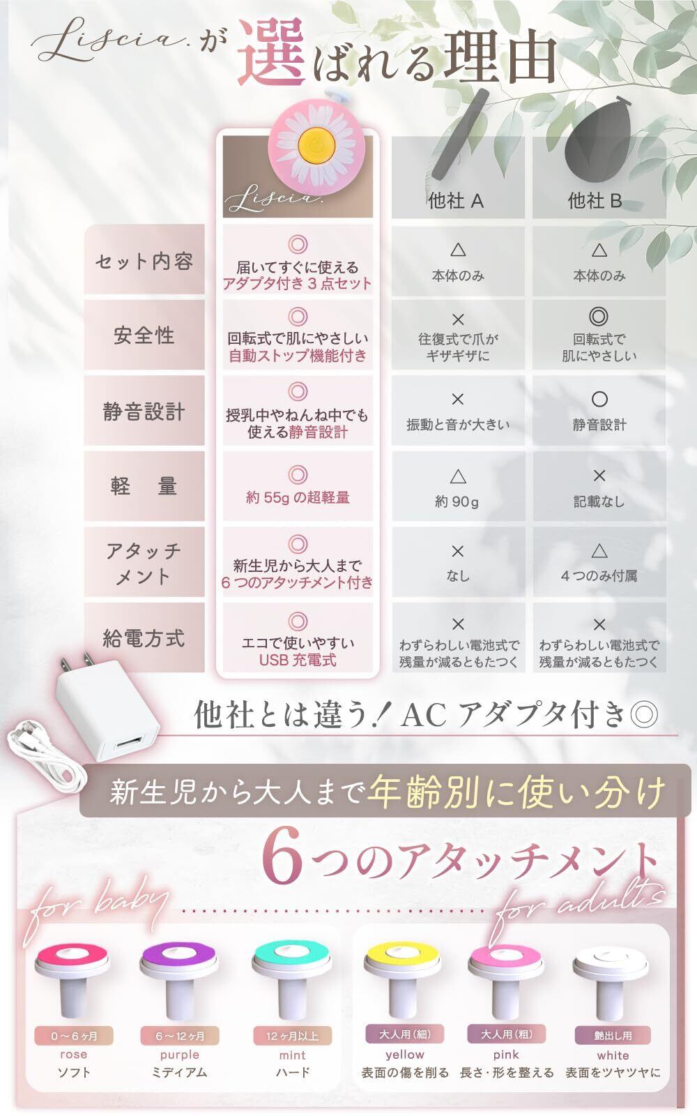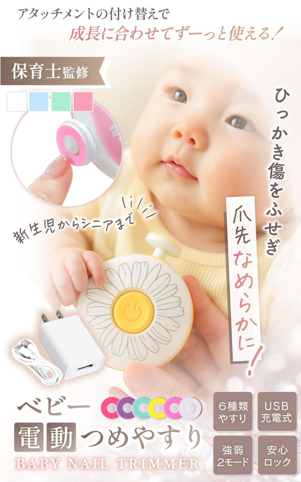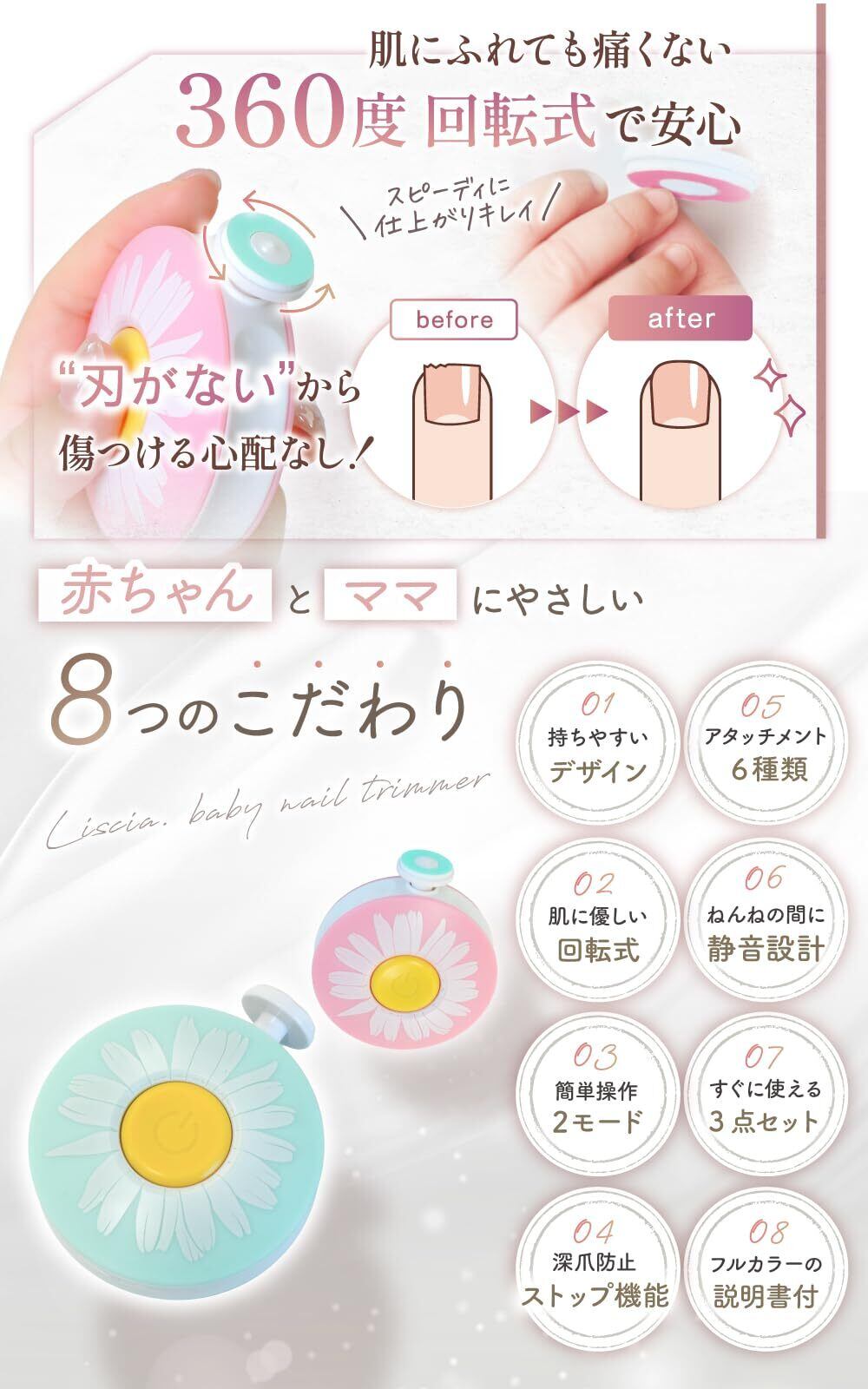 【アタッチメント6種類】月齢や用途に応じて使える6種類のアタッチメントが付属しています。赤ちゃんだけでなく、家族みんなで使用できる多用途設計。爪の形や硬さに合わせて付け替えられるので、成長に合わせて長く使える点も魅力です。日々の爪のお手入れを便利にします。【ねんねの間に静音設計】動作音が小さい静音設計だから、赤ちゃんが眠っている間にも使いやすいのが特徴です。音に敏感な赤ちゃんを起こしにくく、寝ている間にさっとケアできます。夜の授乳後やお昼寝中にも手軽にお手入れでき、育児のすき間時間を有効に使えます。