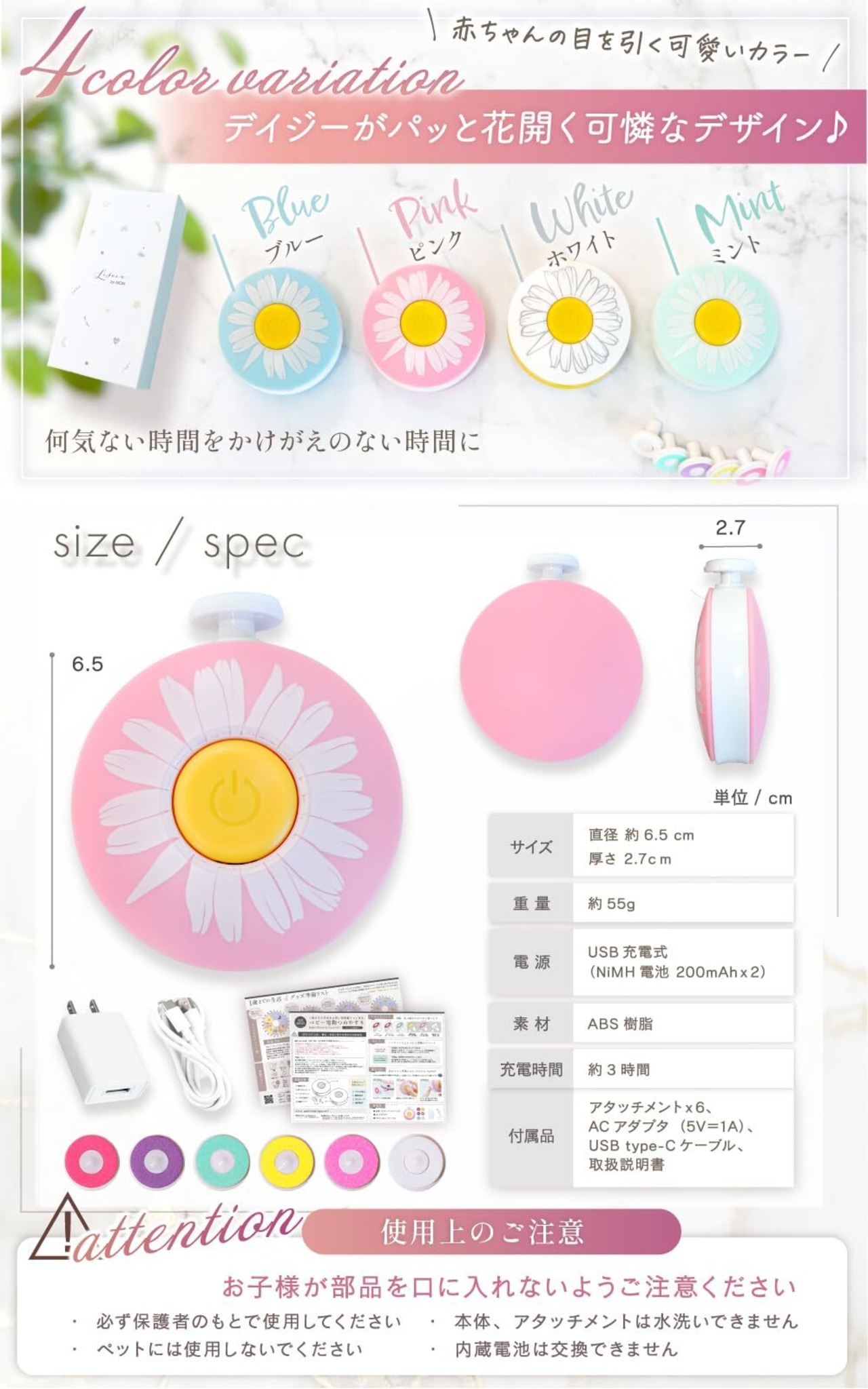 【使い方は簡単3ステップ】使い方はたったの3ステップだから、初めての方も安心してご利用いただけます。アタッチメントを装着して、ボタンを押して、優しく爪に当てるだけ!【本体】直径:約6.5cm 厚さ:2.7cm【重さ】約55g【素材】ABS樹脂【カラー】・ブルー・ピンク・ホワイト・ミント【充電時間】約3時間【付属品】・アタッチメント×6・ACアダプタ(5V=1A)・USB type-Cケーブル・取扱説明書