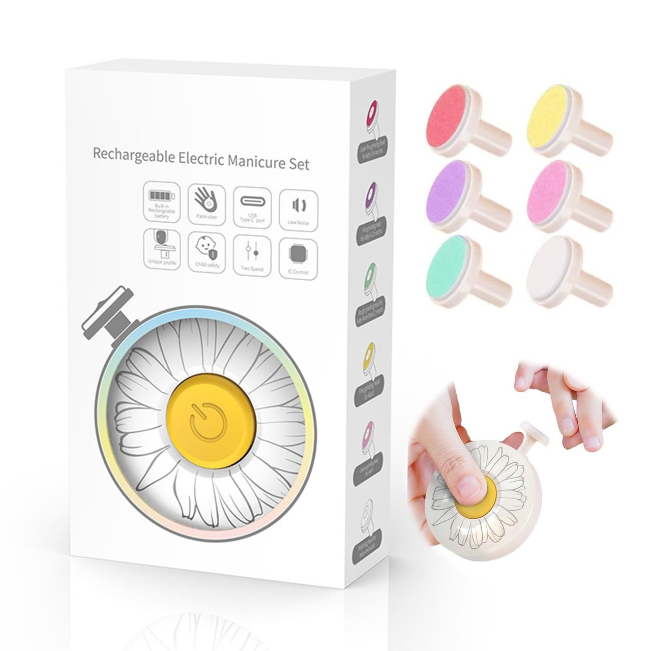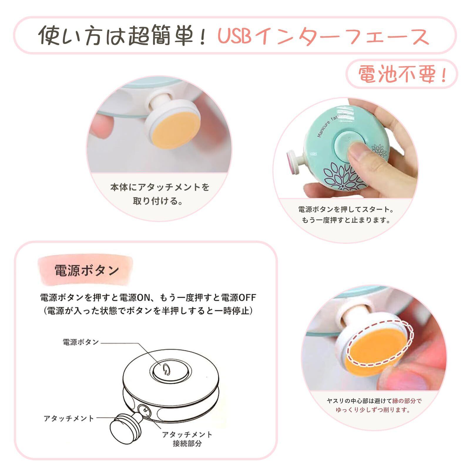【多機能電動爪やすりセット 交換用ヘッド6個付き】ベビーケア用品から大人のネイルケアまで、家族みんなで使える多機能UBS電動爪やすりセットです。電池は必要なく、使用前に充電するだけで、フル充電で2時間使用でき、とても便利です。この製品には、赤ちゃん、幼児、大人まで使用できる 6 つの交換可能なヘッドが付属しています。新生児に適した細かい研磨ヘッドと粗い研磨ヘッドを備え、360 度の円形研磨により鋭い角を滑らかにし、赤ちゃんの繊細な爪を保護します。また、ママやパパが使うのに適した研磨ヘッドツールも付属しており、爪の切りにくい部分をより効果的に磨き、根元の古い角質を取り除き、美しい爪を作ることができます。