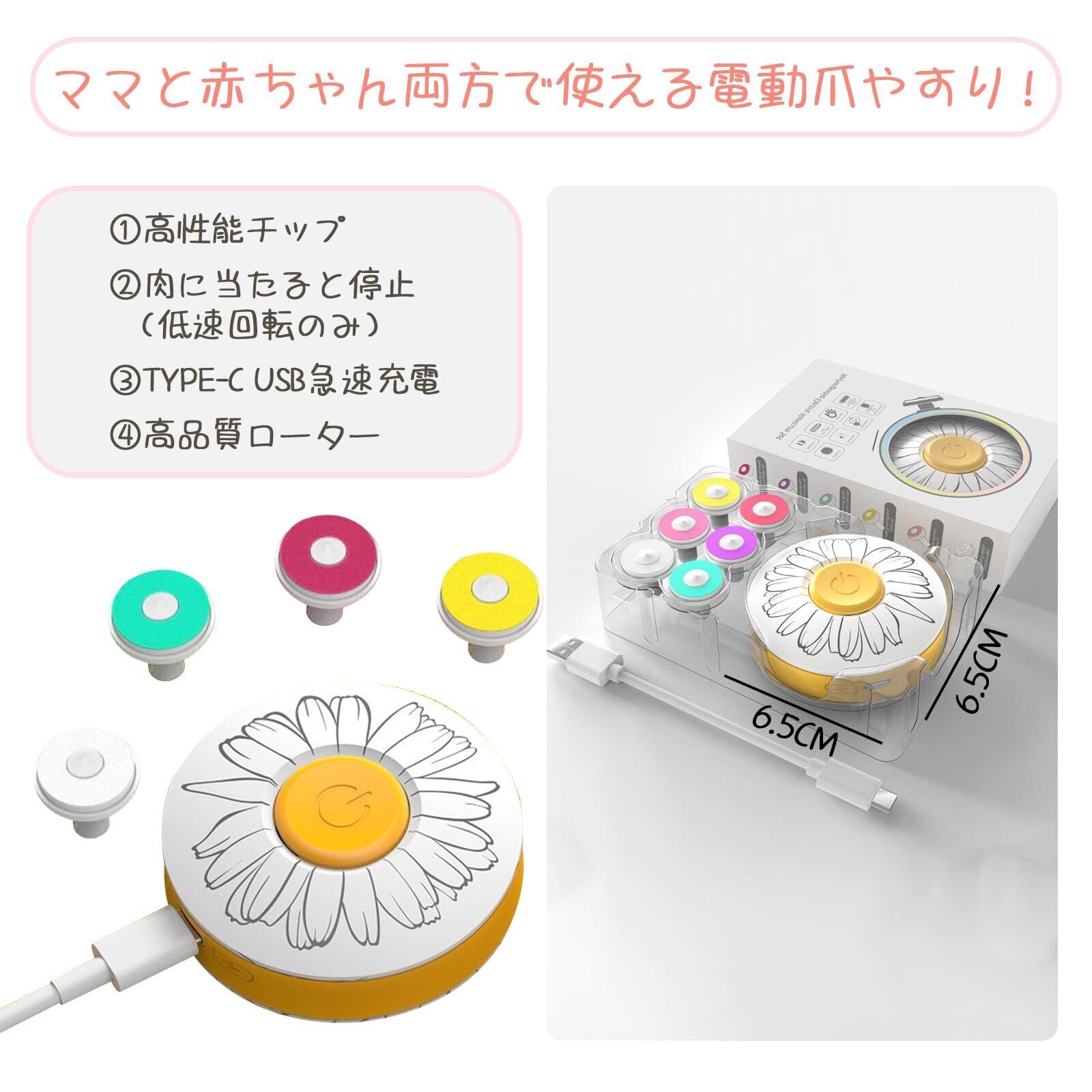 【在庫処分】雲見 赤ちゃん つめきり 電動爪やすり ベビー Type-C 6タイプのアタッチメント付き 赤ちゃん用3種 大人用3種 ベビー 爪切り 2段階の速度調整 幼児・子供用低速 大人用高速 新生児 大人 爪切り 赤ちゃん