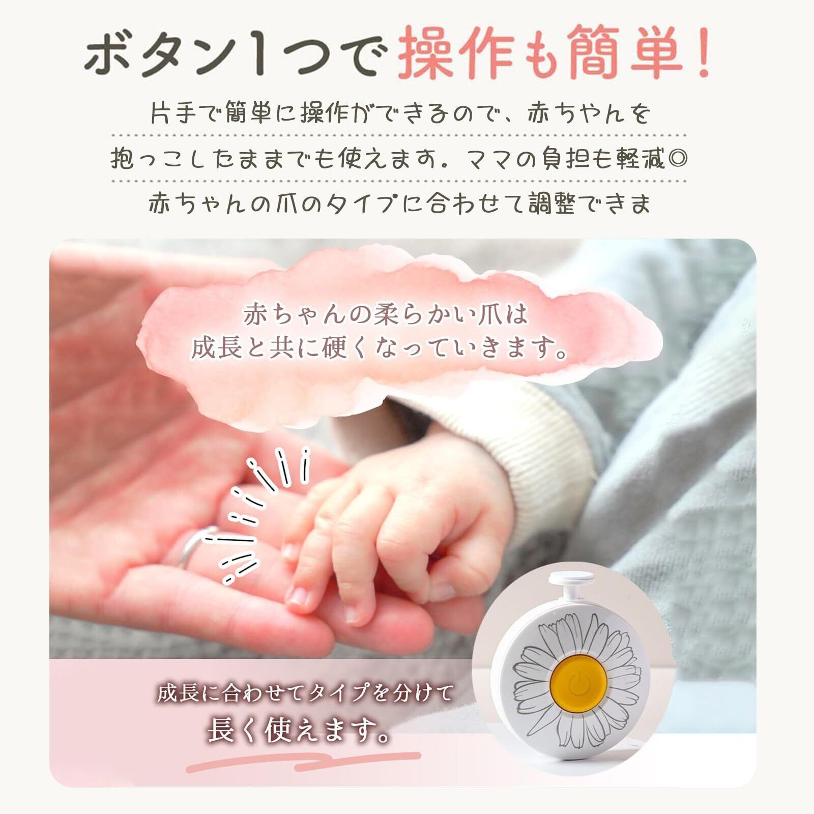 【円形回転デザイン】異なる色の円形回転ヘッドが6つ付いており、初心者の親でも簡単に使用できます。お母さんは赤ちゃんや新生児の繊細な爪に合わせて調整することができ、爪の怪我を防ぎ、赤ちゃんの成長に合わせて柔軟にケアすることができます。注意:付属品を本体に接続するための溝に汚れやほこりがたまると回転に影響を及ぼす場合がありますので、定期的に乾いた柔らかい布や綿棒などで軽く拭いてください。