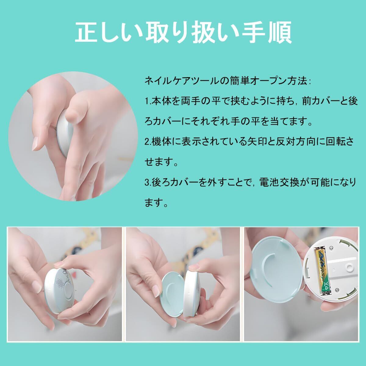 【新生児から使える】 やさしい回転式やすりで赤ちゃんの爪も安心ケア 【静音設計】 寝ている間も音が気にならず、夜間のケアにも最適 【家族みんなで使える】 新生児から大人・高齢者まで幅広く対応 【かわいいデザイン】 デイジー柄はギフトにもぴったり 【コンパクト&軽量】 持ち運びしやすく外出先でも手軽に使える