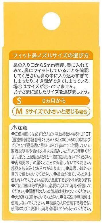鼻吸い器 シュポットシリーズ専用 フィット鼻ノズルSサイズ+Mサイズ <フィット鼻ノズルサイズの選び方> ・鼻の入り口から5mm程度 奥に入れてみて 鼻にフィットしていることを確認してください。 ・鼻の中に入り込みすぎてしまったり すき間が出来てしまっている場合はサイズが合っていません。 ・お子様に成長に合わせて適したサイズを選びましょう