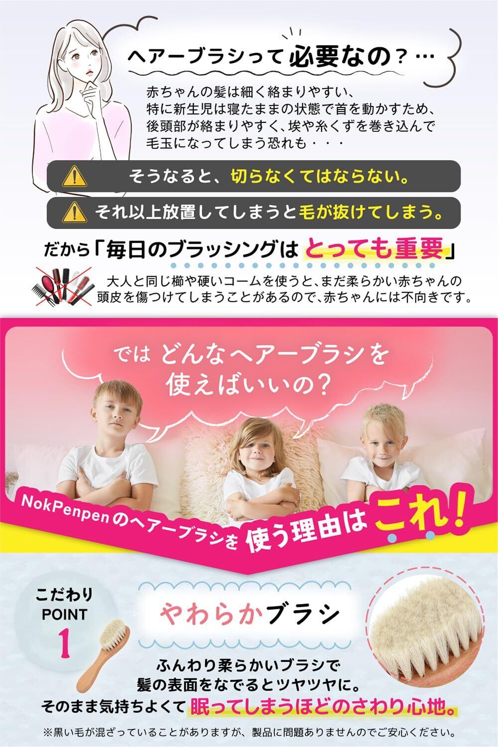 【ふんわり柔らかブラシ】とっても柔らかい羊の毛を採用。赤ちゃんの頭皮を傷つけないので、保育園や幼稚園へ急いでいる朝でもささっと気軽に使用可能。高齢者や治療等で髪や頭皮に負担をかけたくない方へもおススメです。